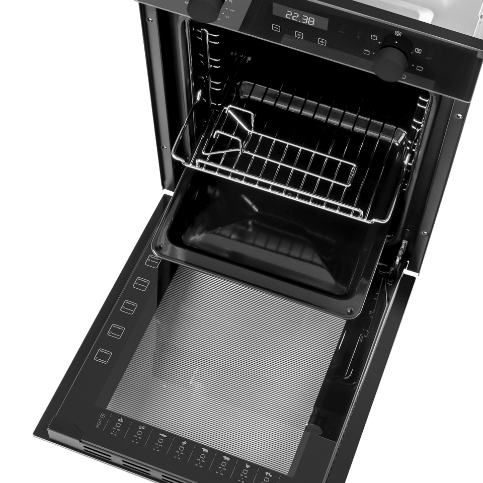 Комбинированное управление реализовано с помощью сенсорного дисплея и цельнометаллических ручек PUSH PULL. Можно установить таймер, выбрать температуру (50°-250°C) и один из 7-ми режимов работы: внутреннее освещение, традиционный нагрев, большой гриль, конвекция с нижним нагревом, нижний нагрев, конвекционный нагрев, малый гриль.