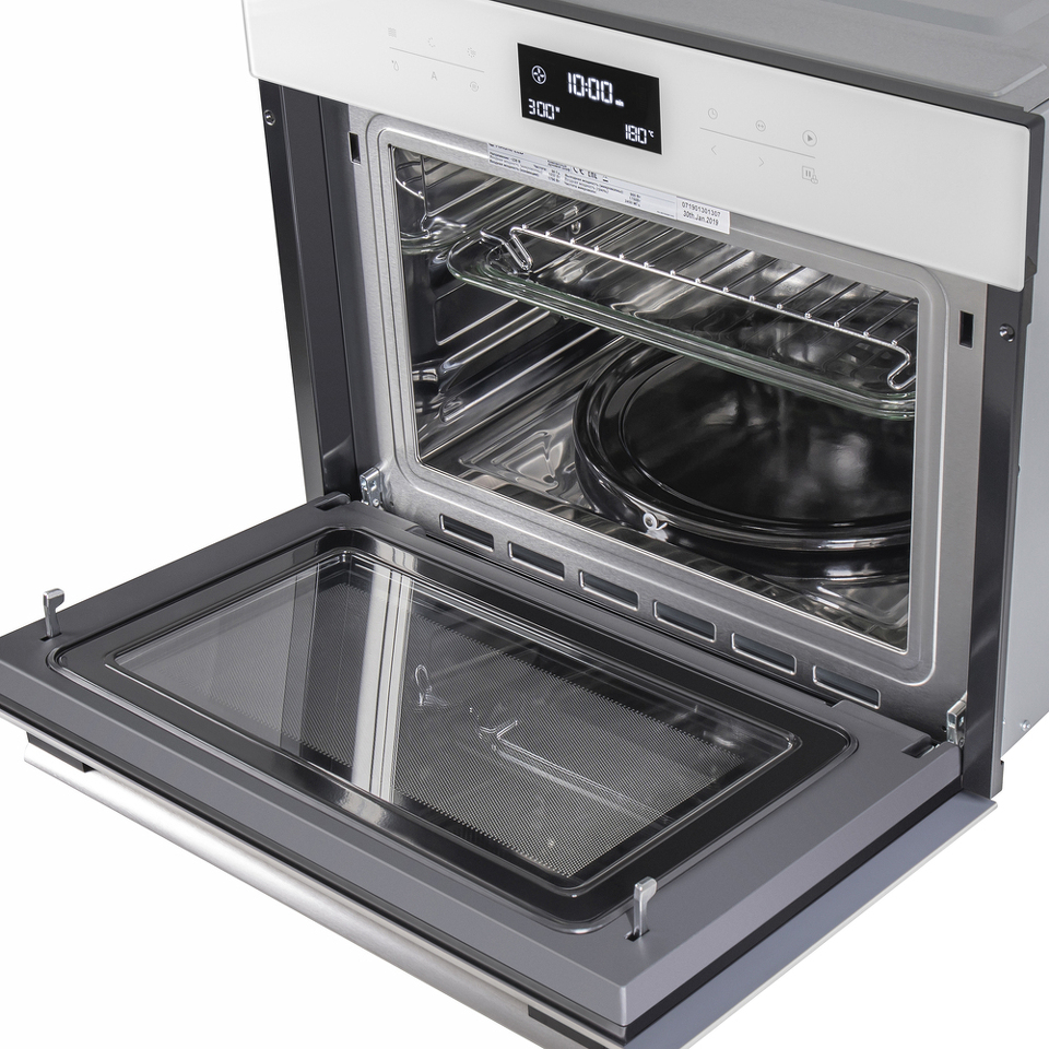 Сенсорное управление с дисплеем COLD WHITE позволит выбрать режим работы, температуру (50°-230°C), установить таймер и блокировку от детей. В данной модели предусмотрены следующие режимы работы: горячий воздух, горячий воздух и нижний нагрев, гриль (имеет 3 режима мощности), гриль+конвекция, горячий воздух + нижний гриль, микроволны, микроволны комби; автоматическая разморозка; предварительный разогрев, 13-программное Авто-меню.