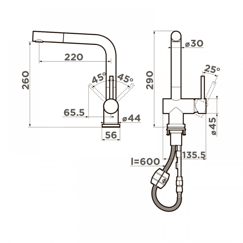• Практичный однорычажный смеситель выполнен в современном стиле и снабжен высоким поворотным изливом и вытяжным шлангом;
