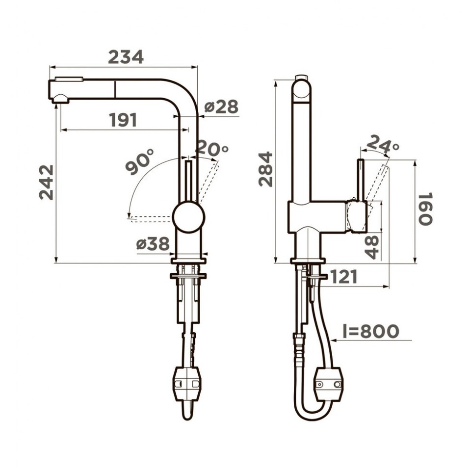 • Практичный однорычажный смеситель выполнен в современном стиле и снабжен высоким поворотным изливом и вытяжным шлангом;