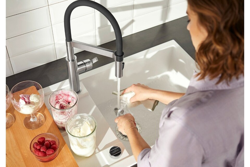 Смеситель Бланко Sonea-S Flexo оснащен гибким резиновым шлангом черного цвета, который обеспечивает удобную подачу воды, его удобно фиксировать точным магнитным держателем. Двухструйный душ легко переключать с ламинарной струи на душевую.