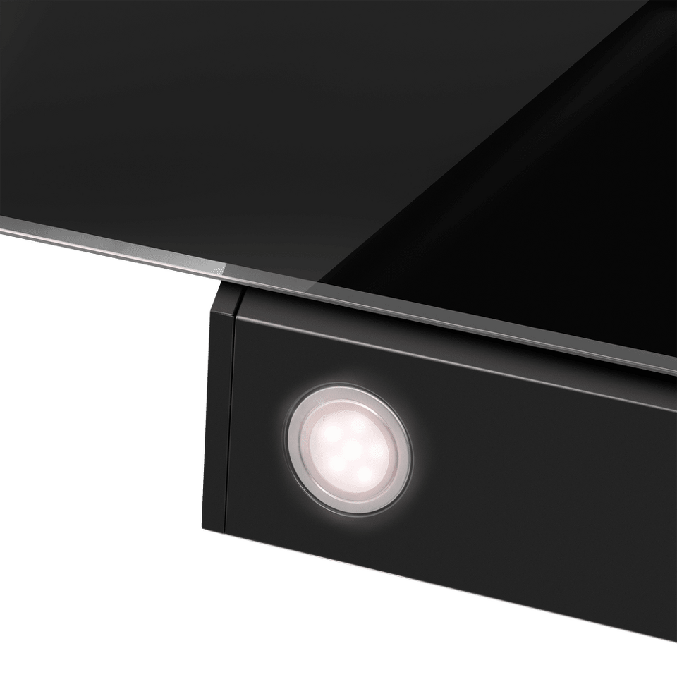 Элегантная наклонная вытяжка шириной 90 см для небольшой кухни. Фасад выполнен полностью из глянцевого закаленного стекла. Сенсорное управление для выбора режима работы и установки таймера.