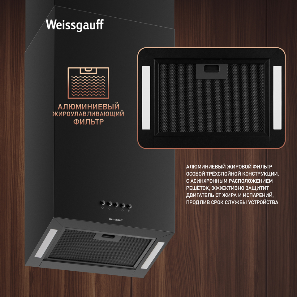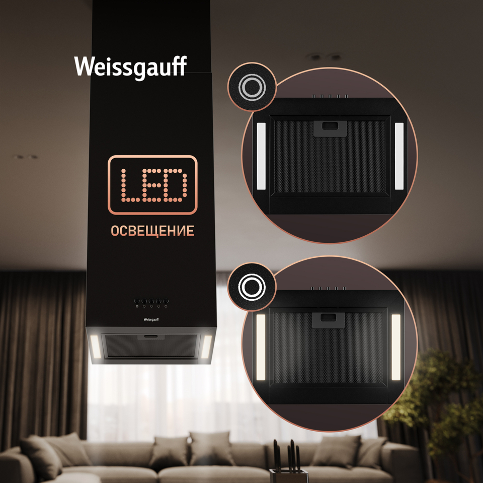 Эффективная работа в помещении площадью до 36 м2 - это гарантия того, что после установки вытяжки Weissgauff, обновление воздуха будет соответствовать требуемым нормам!