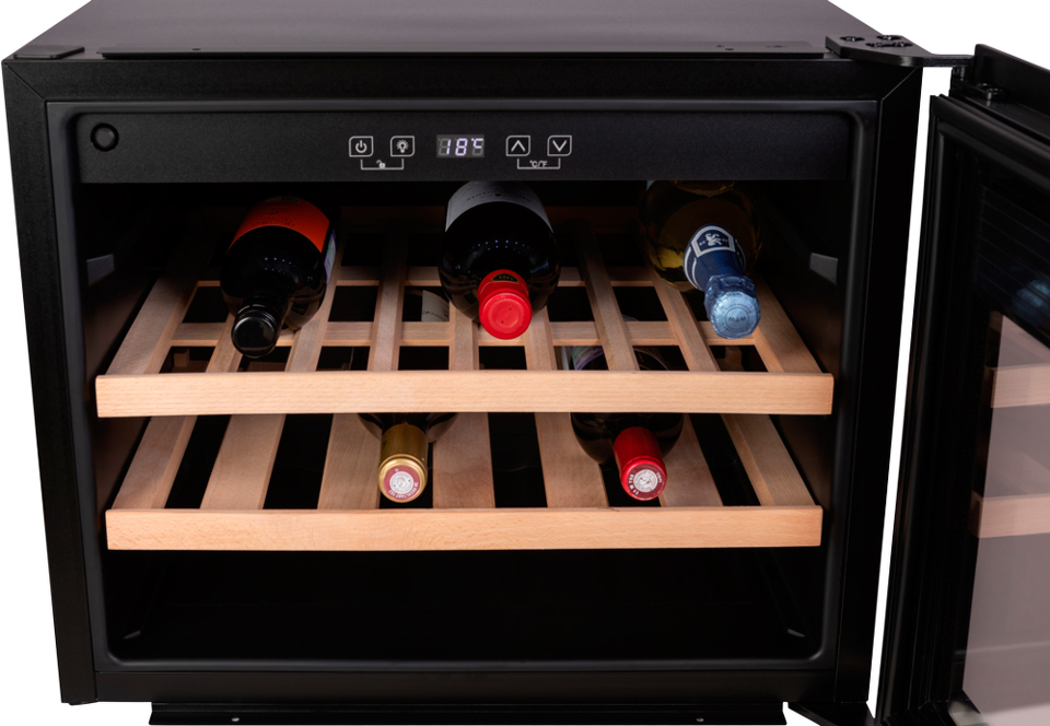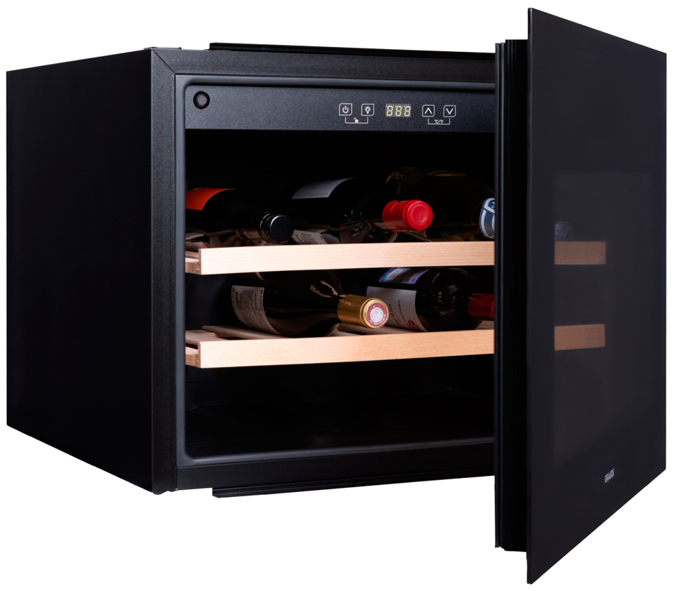 Особенность этой модели — защита стекла от УФ лучей. Это позволяет сохранить все полезные свойства вина, не подвергая его воздействию ультрафиолета. Сенсорное управление делает использование удобным и простым. Все необходимые параметры отображаются на светодиодном дисплее, расположенном внутри камеры. С его помощью можно легко регулировать температурный диапазон от 5 до 22 градусов Цельсия.