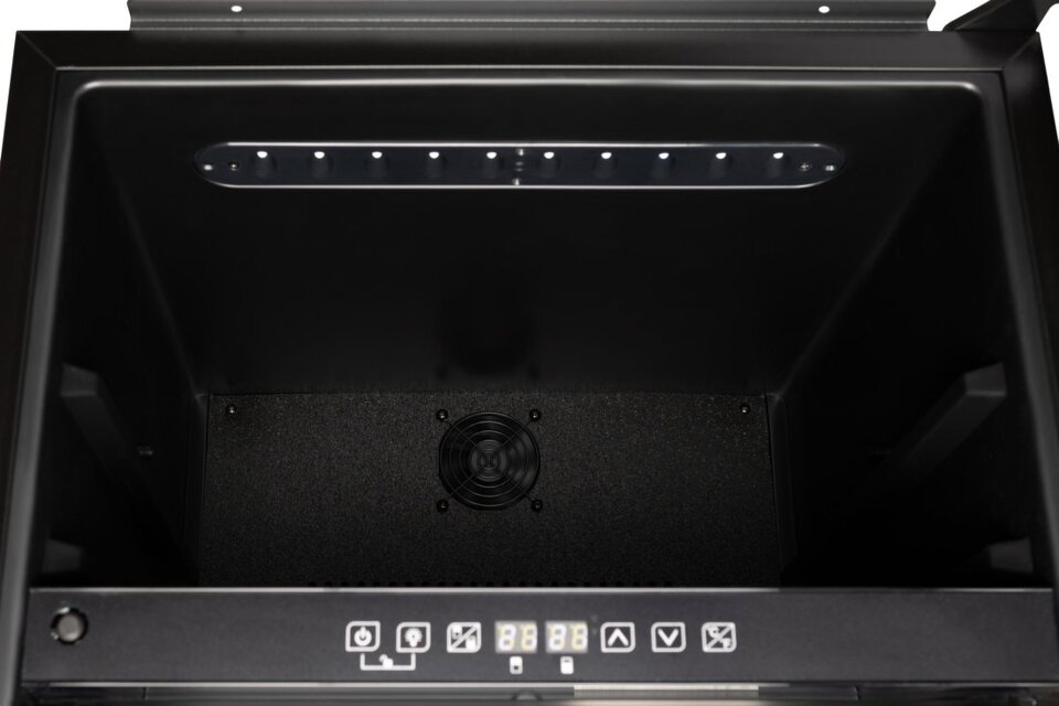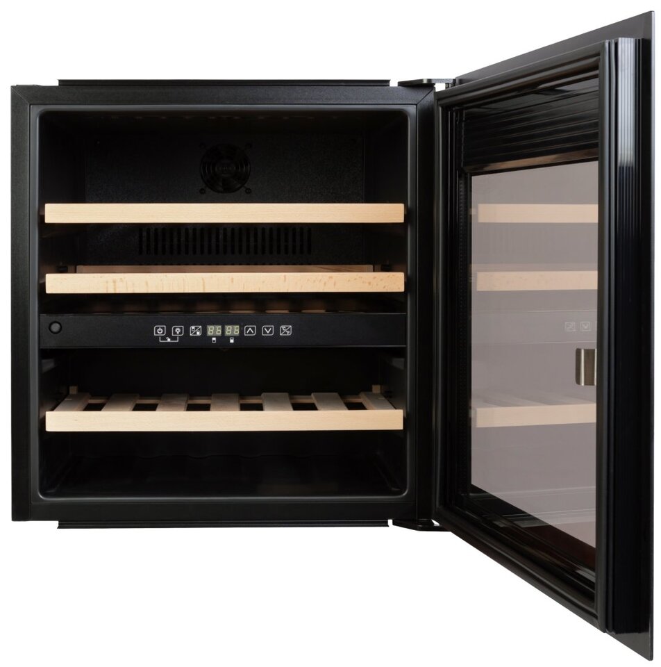 Дизайн выполнен в стильном и современном виде. Черное стекло, защищенное от УФ-лучей, придает ему элегантный и привлекательный внешний вид. Черная рамка двери подчеркивает изысканность этого устройства и делает его идеальным дополнением к любому интерьеру. Шкаф легко встраивается в нишу размером 59-60.5×56-56.8×56 см, что позволяет максимально эффективно использовать пространство кухни.