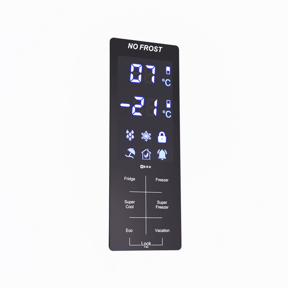 Современный двухкамерный холодильник с сенсорным управлением.
