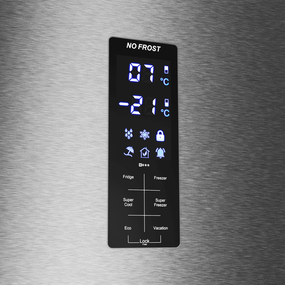 Современный двухкамерный холодильник с сенсорным управлением.
