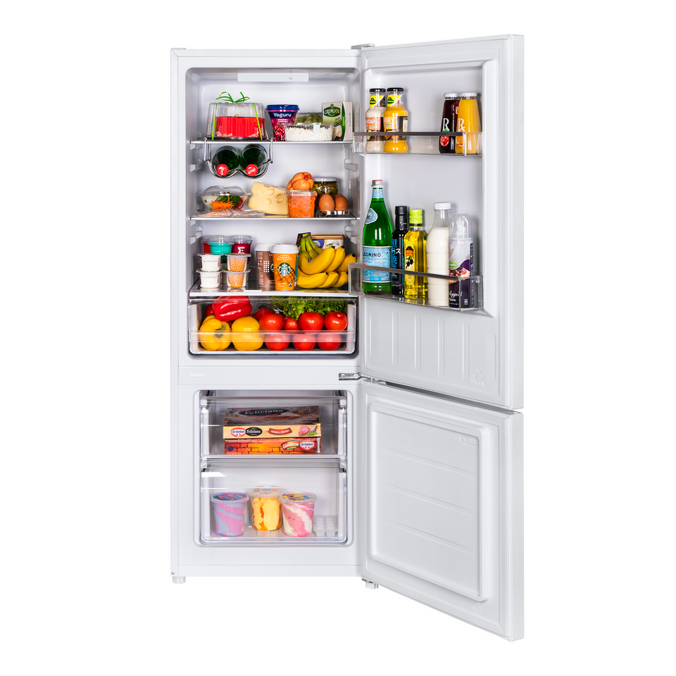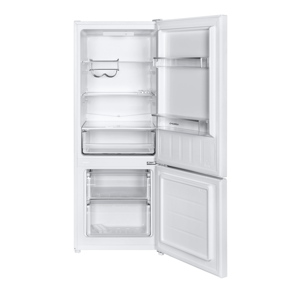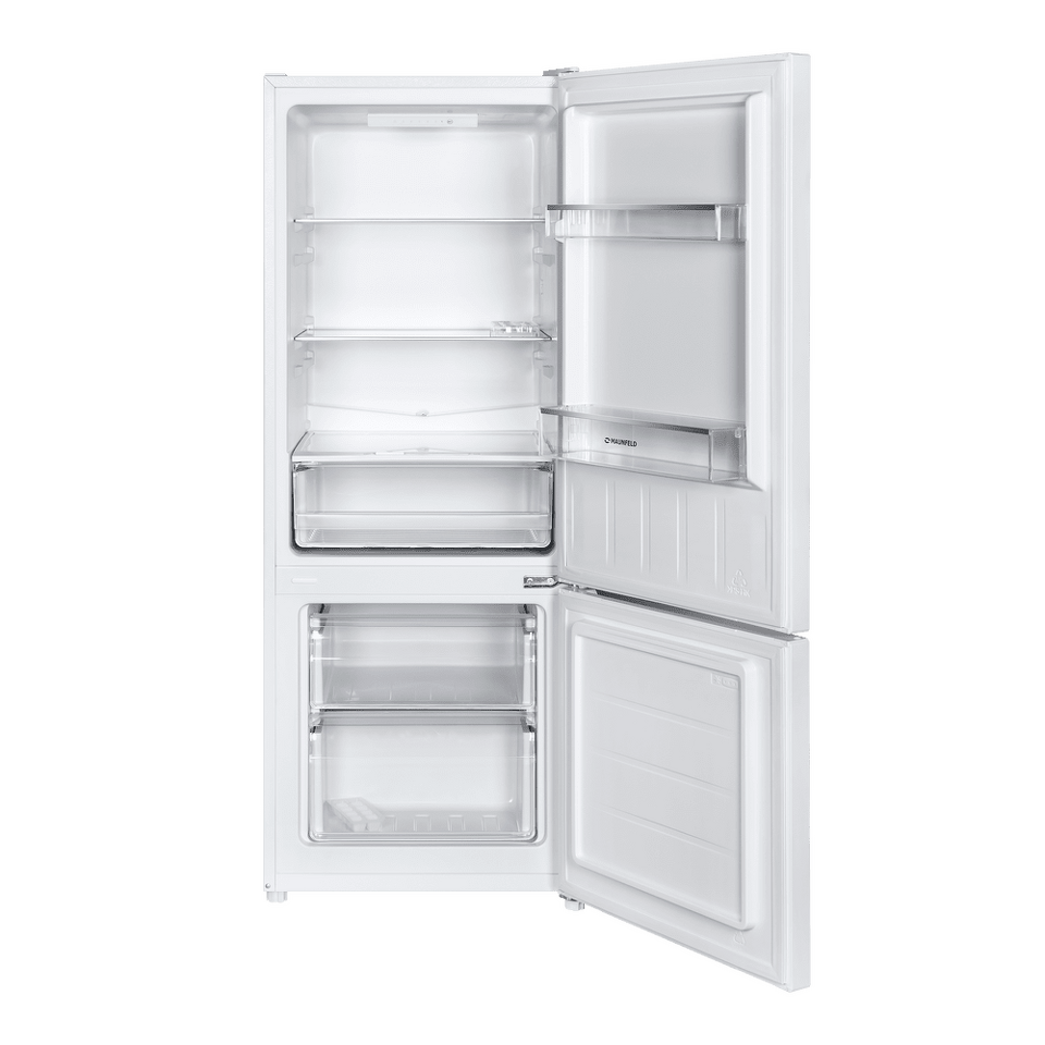 Современный двухкамерный холодильник высотой 144 см с сенсорным управлением.