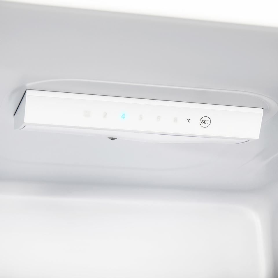 Управление сенсорное. Кнопки включения/выключения, выбора температуры (+2°C до +8°C) и быстрого охлаждения находятся на дисплее в верхней части холодильника.