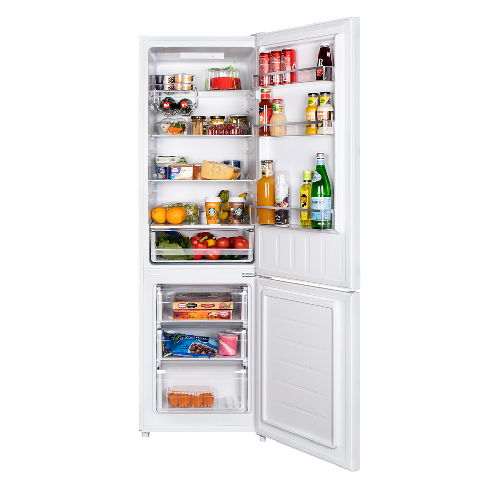 Современный двухкамерный холодильник с электронным управлением, LED-подсветкой, тремя вместительными ящиками в морозильной камере, винной полкой и ящиком для овощей и фруктов с регулировкой влажности в холодильной камере.