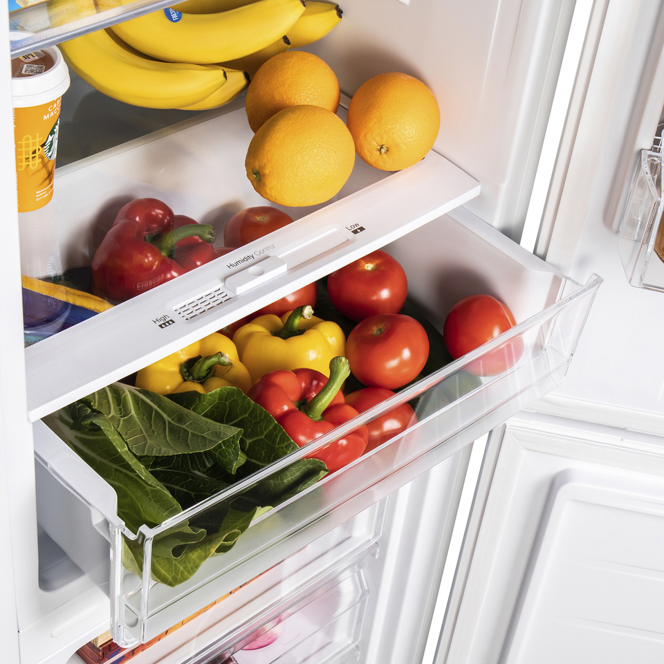 Вместительный ящик для хранения овощей и фруктов оснащен слайдером Humidity Control, который позволяет регулировать уровень влажности и продлевает свежесть продуктов.