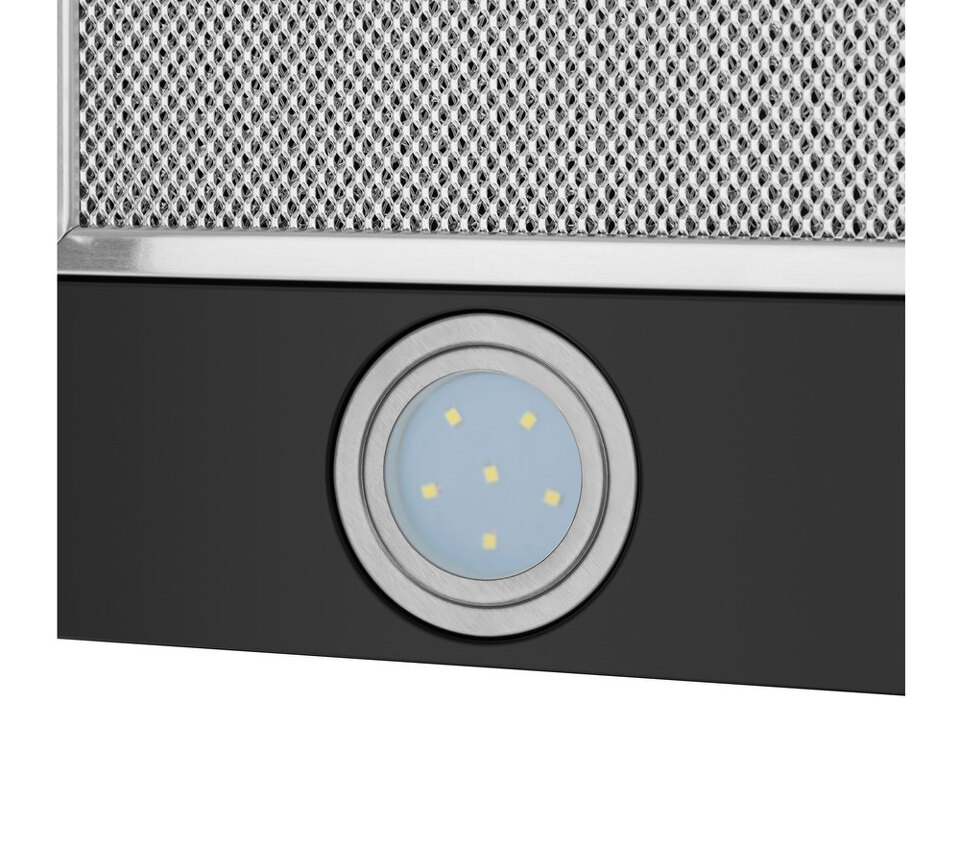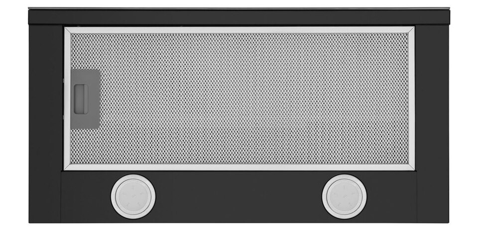 Корпус сделан из нержавеющей стали с качественным покрытием черного цвета. Фасад выдвижной панели из закаленного стекла выполнен в цвет корпуса. Два многослойных жироулавливающих алюминиевых фильтра легко вынуть из вытяжки и помыть при необходимости.