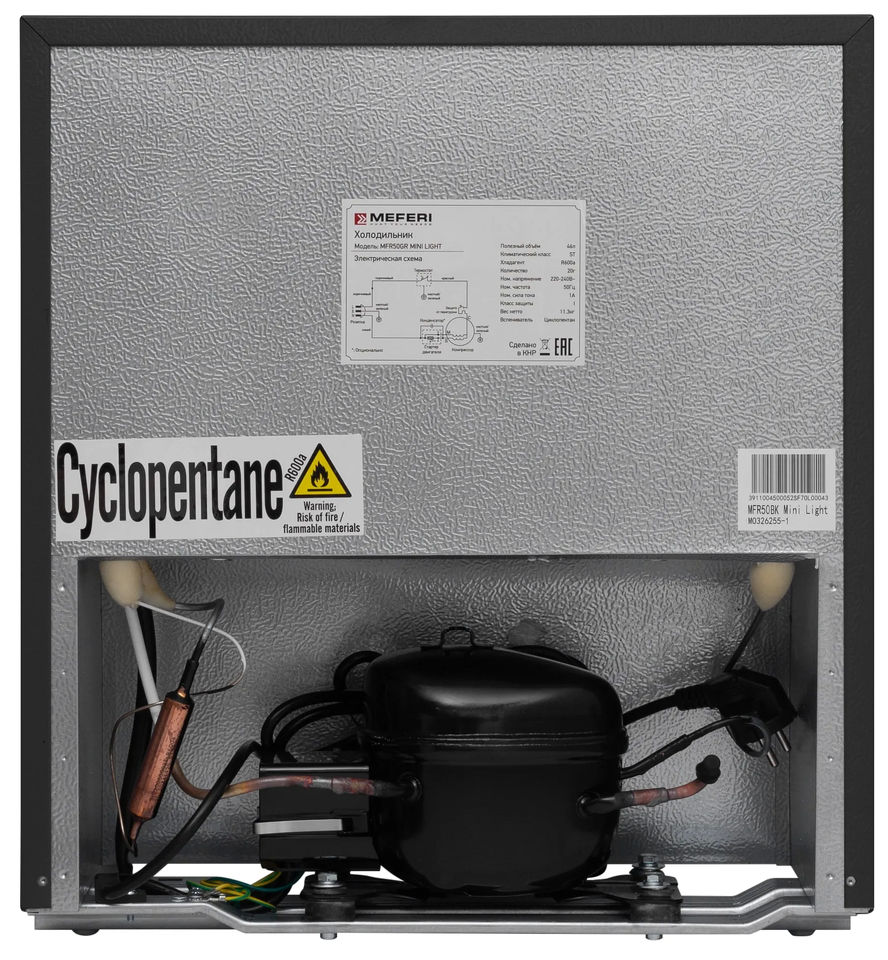 Отдельностоящий холодильник MEFERI MFR50BK MINI LIGHT – это компактное решение для тех, кто ценит оптимальное использование пространства.Холодильник мини-формата идеально подходит для небольших кухонь или офисов.Механическое управление и низкий уровень шума всего 42 дБ обеспечивают комфортное использование.Класс энергетической эффективности А+ делает этот холодильник экономичным и подходящим для повседневного использования.Стильное исполнение в черном цвете придает мини-холодильнику элегантный внешний вид, что подчеркивает современный дизайн вашей кухни.Компактные размеры – 440 мм в ширину, 496 мм в высоту и 454 мм в глубину – делают его легким для размещения в ограниченных пространствах.Общий полезный объем 46 литров создает эффективное пространство для хранения, а также для замораживания небольших количеств продуктов при габаритах компактного холодильника.С одной металлической полкой и одной полкой на двери вы сможете удобно организовать хранение продуктов.Холодильник со встроенным низкотемпературным отделением объемом 5 литров сохраняет продукты свежими благодаря более низким температурам.