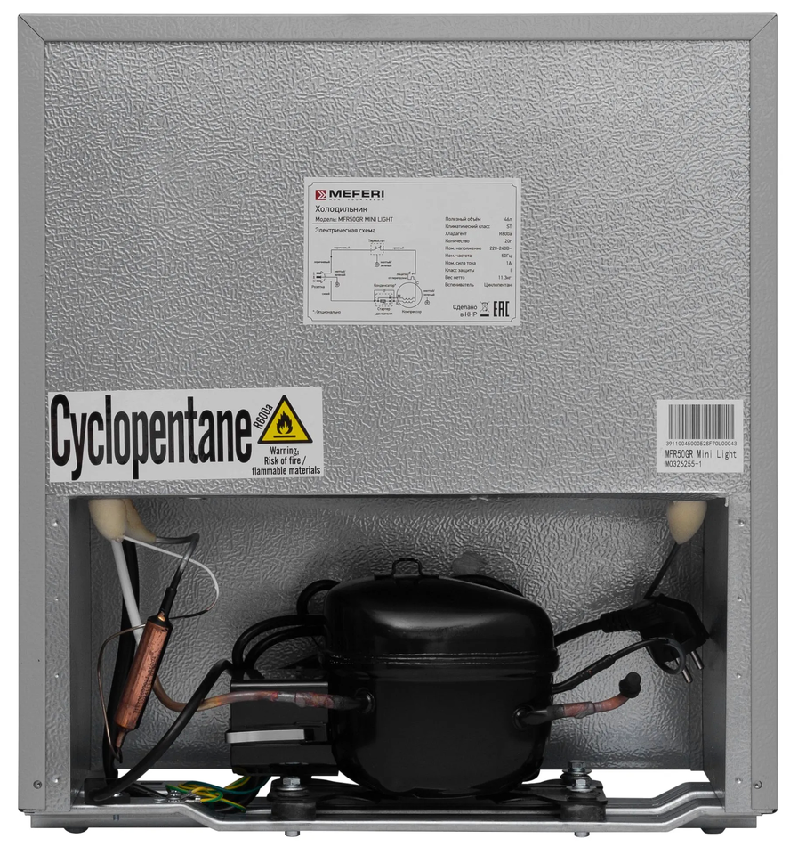 Отдельностоящий холодильник MEFERI MFR50GR MINI LIGHT – это компактное решение для тех, кто ценит оптимальное использование пространства.Холодильник мини-формата идеально подходит для небольших кухонь или офисов.Механическое управление и низкий уровень шума всего 42 дБ обеспечивают комфортное использование.Класс энергетической эффективности А+ делает этот холодильник экономичным и подходящим для повседневного использования.Стильное исполнение в сером цвете придает мини-холодильнику элегантный внешний вид, что подчеркивает современный дизайн вашей кухни.Компактные размеры – 440 мм в ширину, 496 мм в высоту и 454 мм в глубину – делают его легким для размещения в ограниченных пространствах.Общий полезный объем 46 литров создает эффективное пространство для хранения, а также для замораживания небольших количеств продуктов при габаритах компактного холодильника.С одной металлической полкой и одной полкой на двери вы сможете удобно организовать хранение продуктов.Холодильник со встроенным низкотемпературным отделением объемом 5 литров сохраняет продукты свежими благодаря более низким температурам.