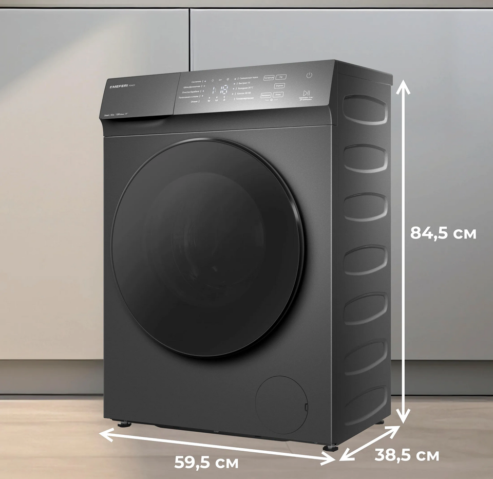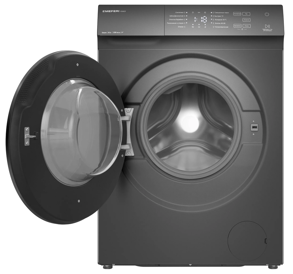 Технические характеристики MEFERI MFW081210GR POWER:Класс энергоэффективности: A++ — экономия электроэнергии и воды, снижая расходы и заботясь об экологии.Максимальная загрузка: 8 кг — оптимальный объем для семьи среднего размера.Максимальная скорость отжима: 1200 об/мин — эффективное удаление влаги для быстрого высыхания белья.Количество программ стирки: 10, включая режимы для смешанных тканей, гипоаллергенной стирки, деликатного шелка, быстрой стирки за 15 минут и холодной стирки при 20℃.Объем барабана: 45 литров — из нержавеющей стали, обеспечивающий бережный уход за тканями.Функция обработки паром: помогает эффективно удалять пятна, освежать и смягчать ткани, что особенно важно для семей с детьми и аллергиков.Управление: LED-дисплей и сенсорная панель — интуитивно понятное и удобное управление программами и настройками.Отсрочка старта: 1–24 часа — возможность планировать стирку на удобное время.Регулировка температуры, интенсивности стирки и скорости отжима: гибкая настройка для максимального комфорта.Функция дополнительного полоскания: для тщательного удаления остатков моющих средств.Безопасность: блокировка управления и люка от детей, защита от перелива, контроль пенообразования — надежная защита и безопасность в эксплуатации.Уровень шума: 58 дБ при стирке и 76 дБ при отжиме — тихая работа, не мешающая домашнему комфорту.Размеры: ширина 595 мм, высота 845 мм, глубина 385 мм — компактные габариты, идеально подходящие для небольших квартир и ограниченного пространства.Функция автовзвешивания: интеллектуальное определение веса белья для оптимизации расхода воды и электроэнергии, исключая нерациональный расход ресурсов.