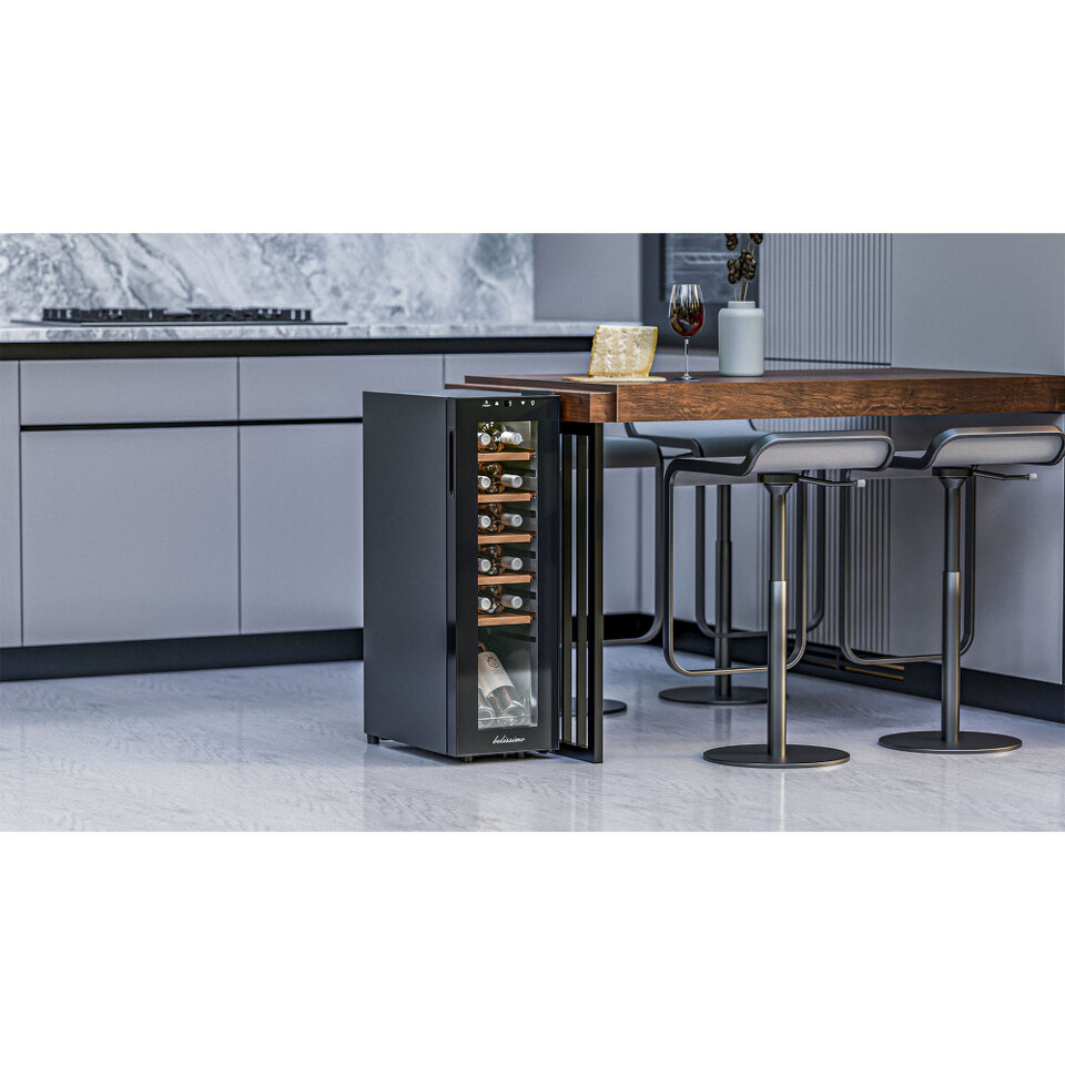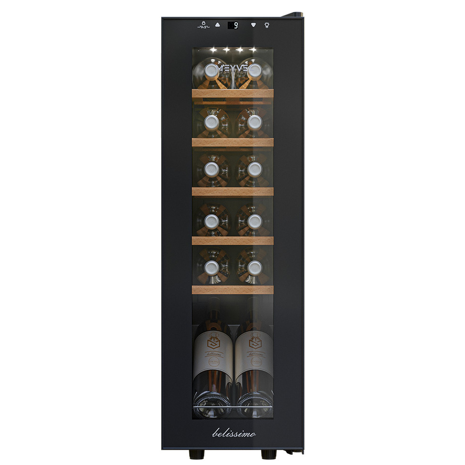 В винный шкаф помещается 12 бутылок, и это оптимальный объём для тех, кто только начинает собирать коллекцию или предпочитает держать под рукой небольшой, но тщательно отобранный набор вин. При этом устройство не выглядит громоздким и отлично вписывается даже в небольшие помещения.