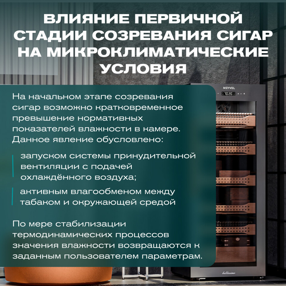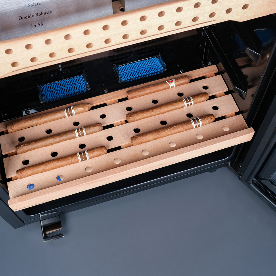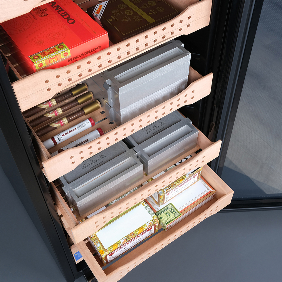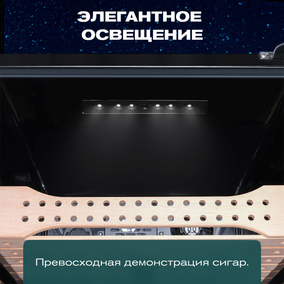 Особенность модели — точный температурный контроль в диапазоне от +16 до +22°C и уровень влажности 60-75%, что позволяет поддерживать оптимальные условия для хранения и бережного созревания табачных изделий. Внутренняя подсветка и встроенный гигрометр упрощают мониторинг состояния коллекции.