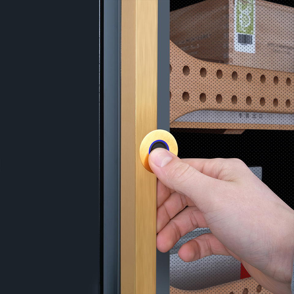 Управляется хьюмидор с помощью сенсорной панели, а дверь, оснащенная магнитным уплотнителем, открывается с помощью отпечатка пальца, обеспечивая защиту содержимого. Хьюмидор устойчиво будет стоять на любой поверхности, благодаря регулируемым ножкам.