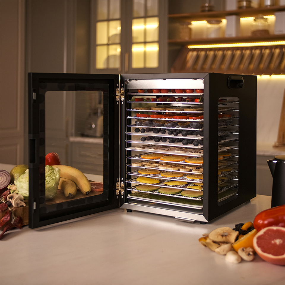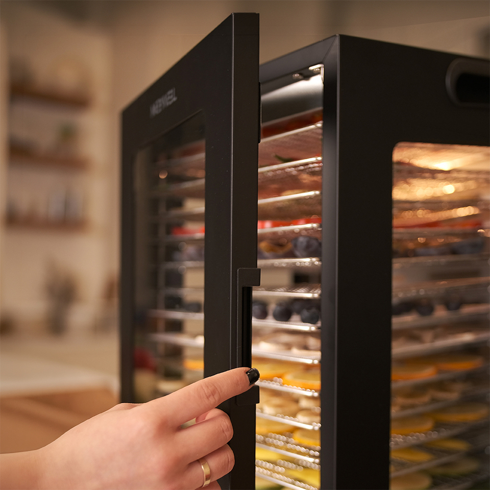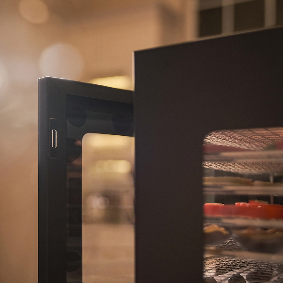 За процессом можно наблюдать через жаропрочное стекло, а встроенная подсветка помогает контролировать сушку даже при слабом освещении в помещении. Для удобства перемещения предусмотрены боковые ручки.