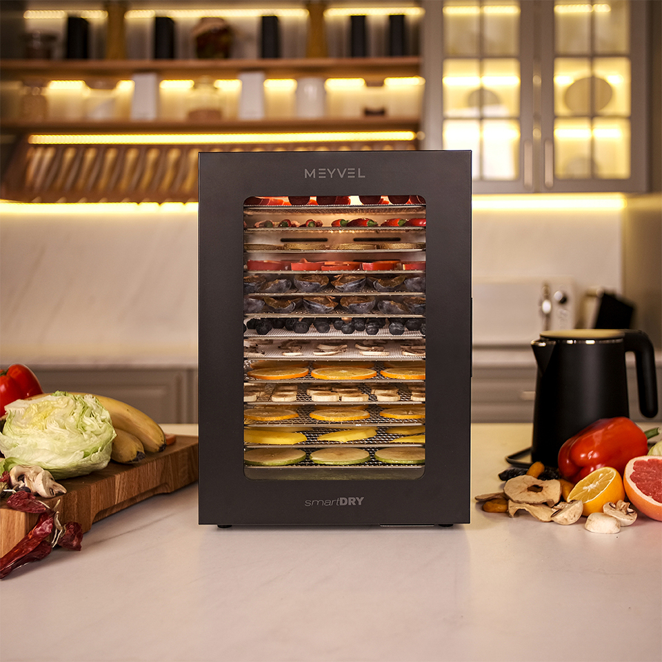 Дегидратор Meyvel MDH14-2S (Black) создан для тех, кто предпочитает натуральные продукты и хочет сам контролировать процесс их приготовления. Он легко высушивает фрукты, овощи, мясо, зелень или готовит домашние снеки — без сахара, добавок и консервантов.
