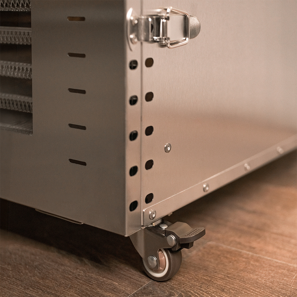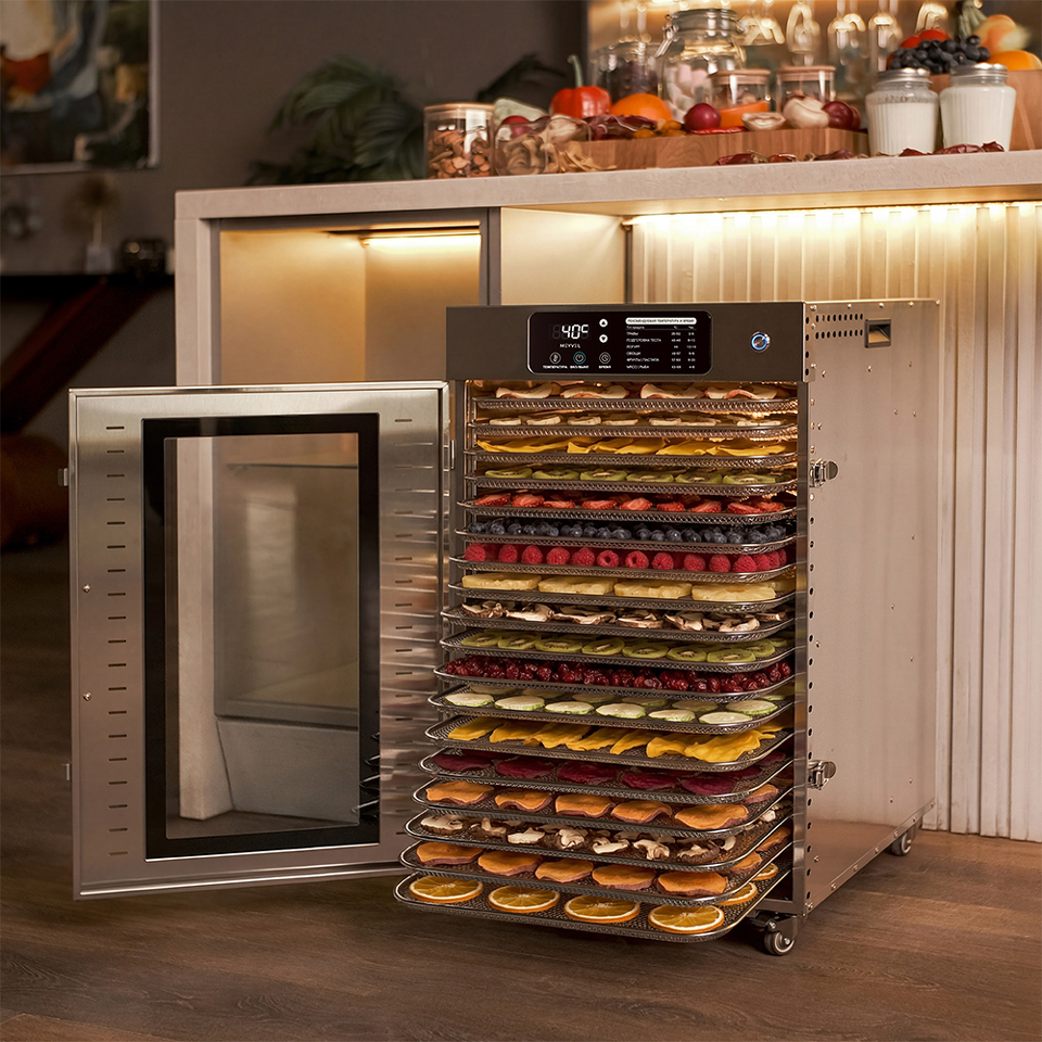 Корпус из прочной нержавеющей стали устойчив к высоким температурам и влаге, поэтому дегидратор долговечен и прост в уходе. Внутренняя камера оборудована 18 уровнями, между которыми выдержано оптимальное расстояние 30 мм для равномерной циркуляции воздуха.