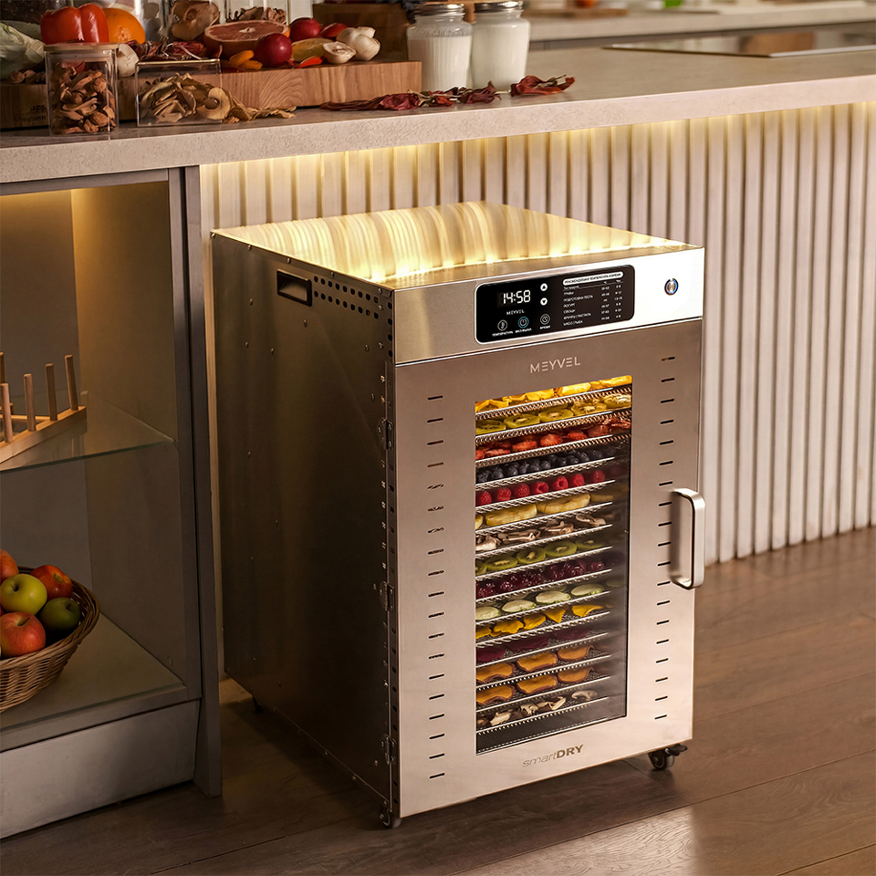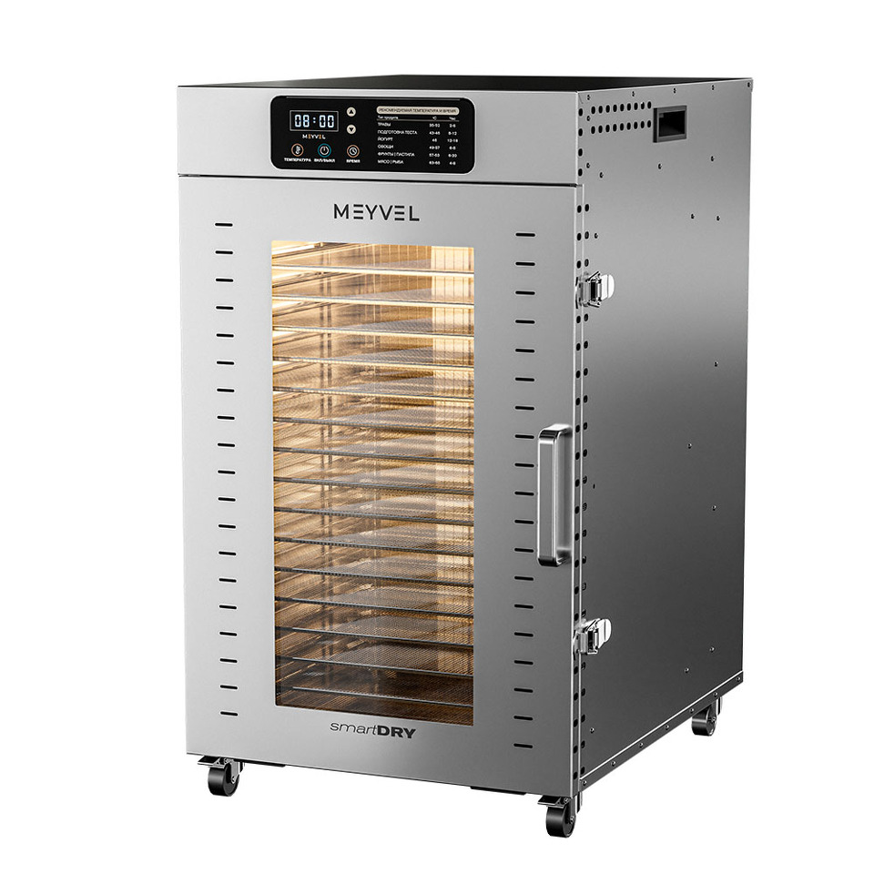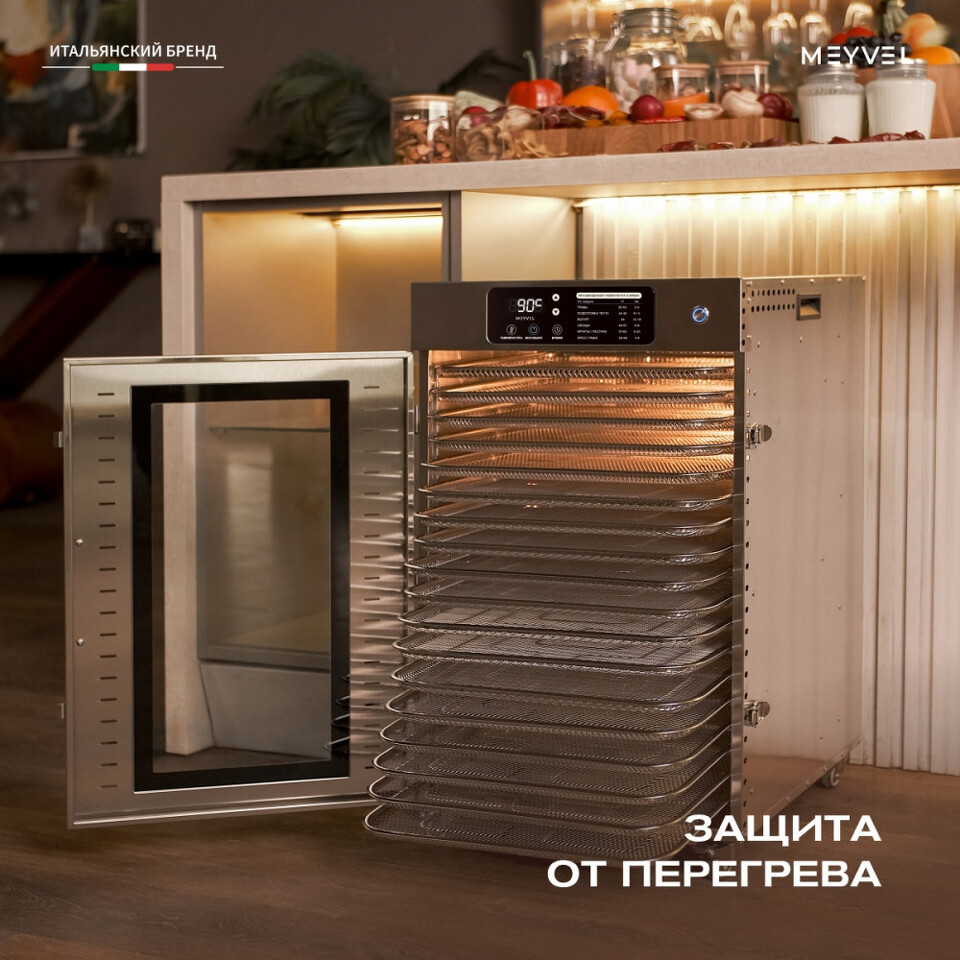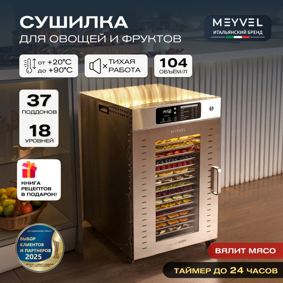 Meyvel MDH18-1S (Нержавеющая Сталь) (Inox) на 25 кг — это мощный дегидратор из нержавеющей стали для бережного высушивания продуктов без потери их вкуса, цвета и пользы. Он функционален, как профессиональная техника, и удобен, как простое домашнее устройство.