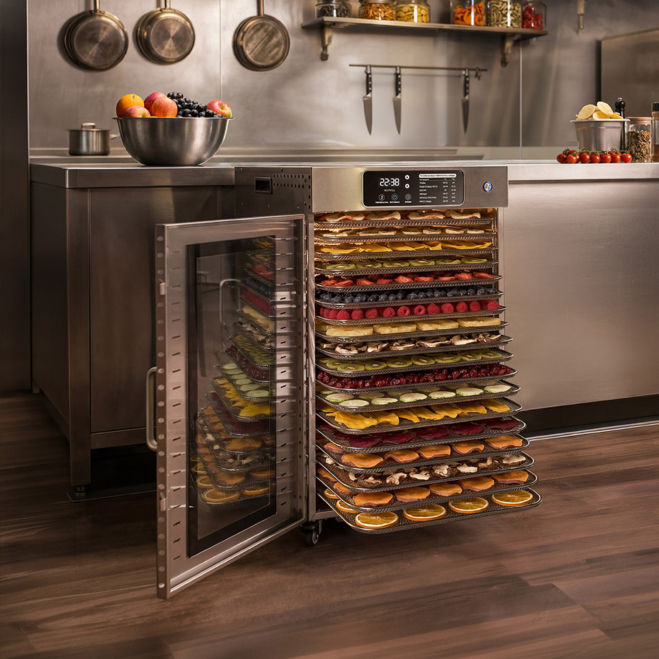 Для кафе, баров и небольших производств. Устройство подходит для заведений, где требуется регулярная сушка ингредиентов: ломтиков цитрусов для декора коктейлей, трав, фруктовых гарниров, чипсов к подаче блюд. Дегидратор работает стабильно и равномерно, выдерживает длительные циклы (до 24 часов).
