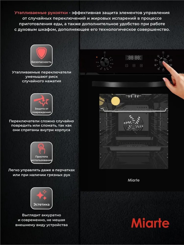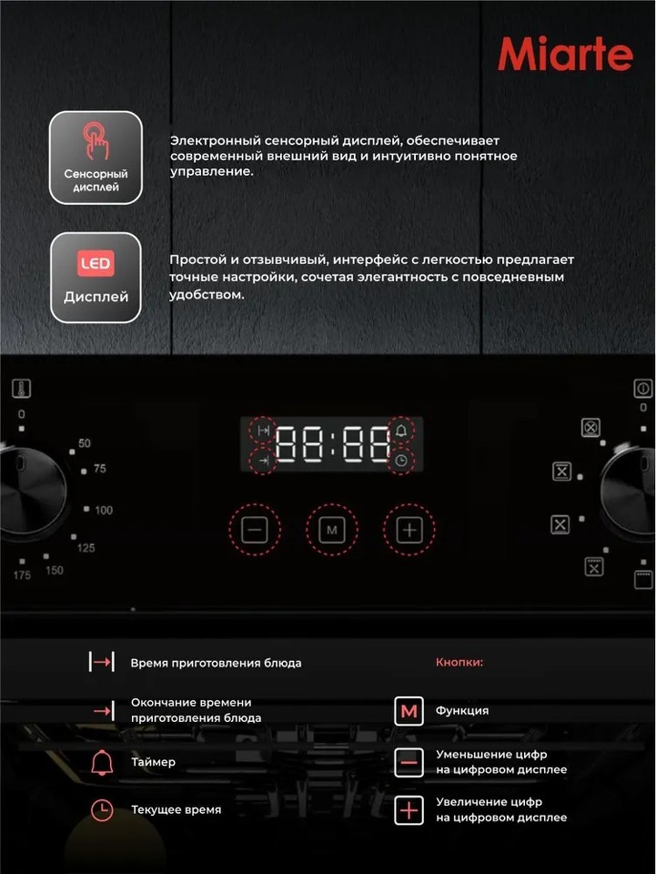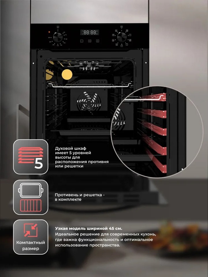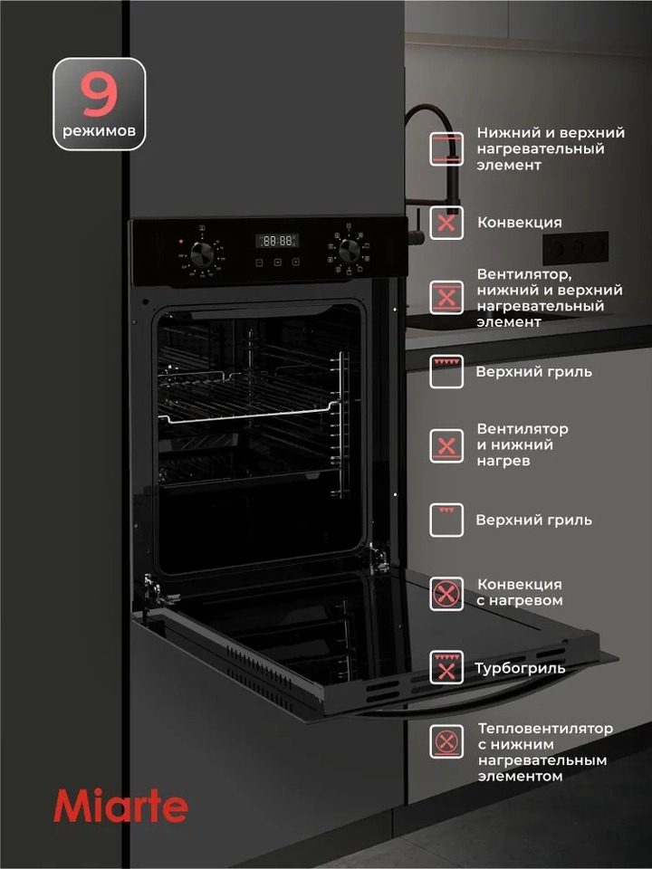 Духовой шкаф электрический встраиваемый Miarte OV5751C Элегантность и функциональность в одном устройстве Это прекрасный вариант для современной кухни, который сочетает в себе высокую производительность и стильный дизайн. Узкая кухонная духовка выполнена из качественных материалов, что обеспечивает долгий срок службы. Основные характеристики: - Энергоэффективность: электро печка экономит ваш бюджет и снижает потребление электроэнергии. - Объем составляет 49 литров, что позволяет готовить большие порции без необходимости использовать дополнительные устройства. - Технологии: оснащен грилем, конвекцией и функцией поддержания постоянной температуры, что делает его универсальным инструментом для приготовления различных блюд. Преимущества: - Электронно-механическая система управления с дисплеем обеспечивает удобство использования и точный контроль. - Галогеновая подсветка и индикаторы времени и режима дают возможность легко следить за процессом даже в затемненных помещениях. - Защита от перегрузки: Автоматический предохранитель гарантирует безопасность вашего оборудования и предотвращает возможные поломки. - Компактный: Шириной 45см, печь прекрасно впишется в стандартные размеры ниши. Не упустите возможность купить электродуховку прямо сейчас! - Черное эмалированное покрытие добавляет изюминку внешнему виду, а также защищает поверхность от царапин и повреждений.