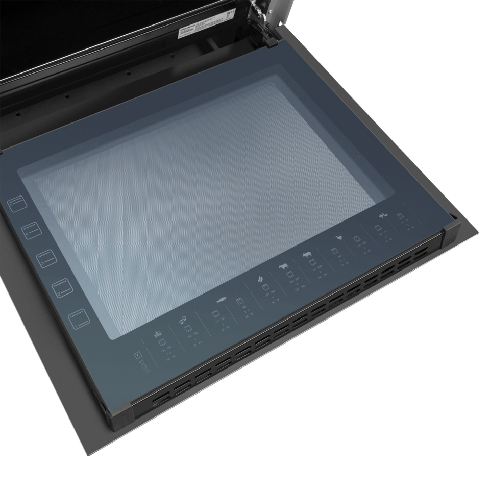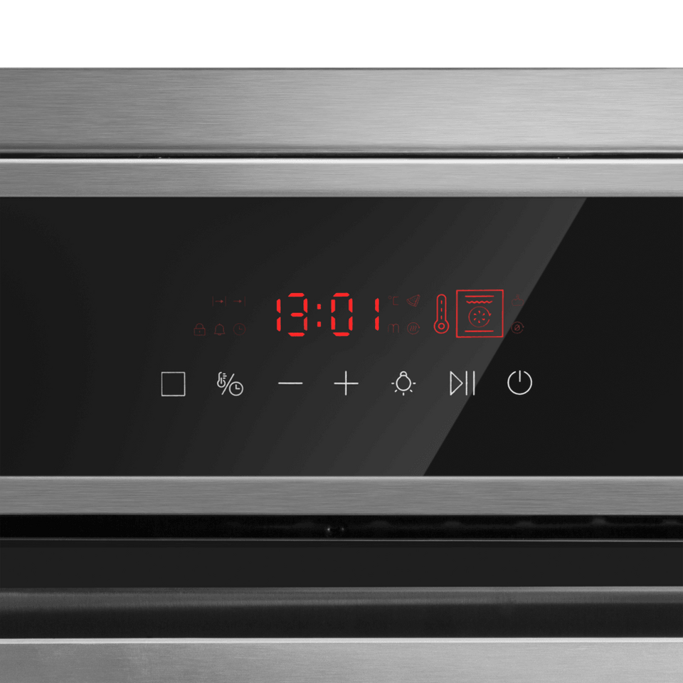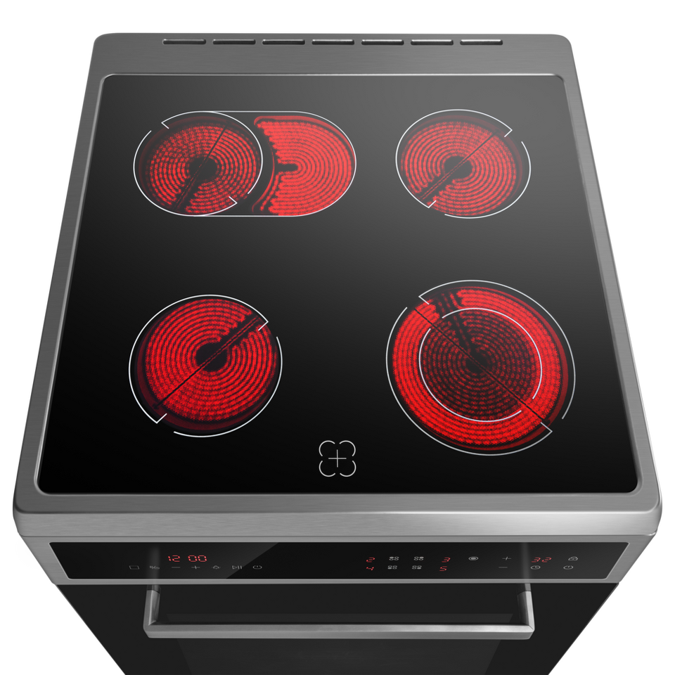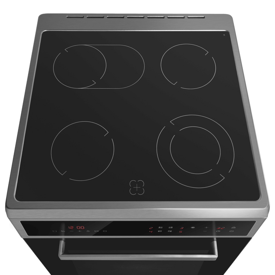 Полноразмерная электрическая плита с сенсорным управлением, варочная поверхность - стеклокерамическая. Техническое оснащение также на уровне - конфорки рабочего стола и духовой шкаф управляются сенсорами, в комплектацию входит многофункциональный таймер. Духовой шкаф оснащен конвекцией и грилем. Благодаря яркому внутреннему освещению виден весь объем духовки, нет необходимости открывать дверцу для контроля готовности блюда. Комфортная в эксплуатации, для удобства ухода за плитой, направляющие для противней - съемные и легко чистятся. Предусмотрен и ящик для хранения кухонной посуды. Модель по праву заслуживает место на Вашей кухне.