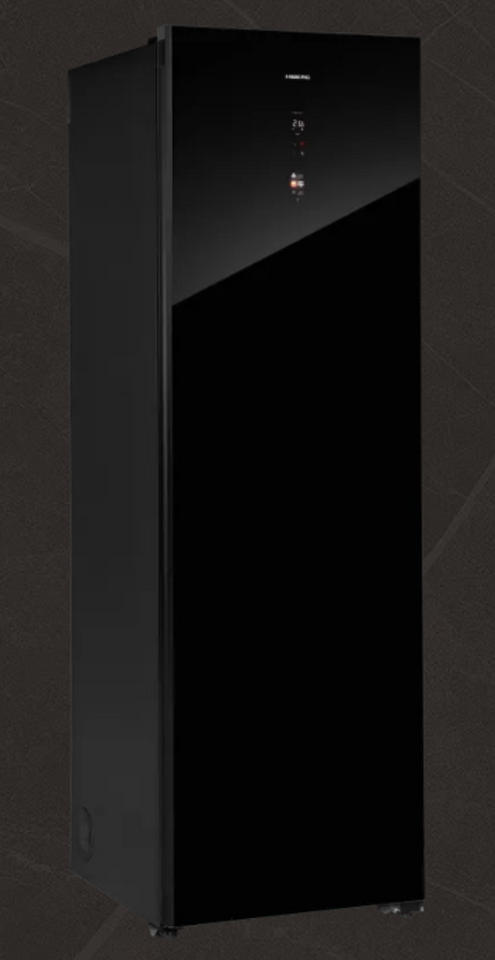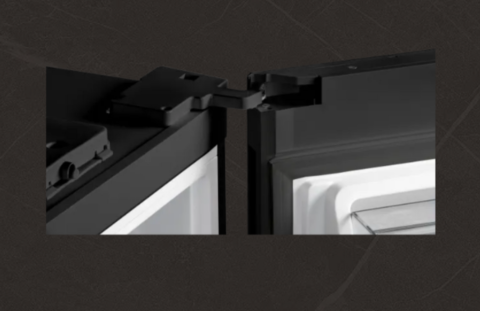 Дверь вертикального морозильника имеет уникальный дизайн, выполнена из закаленного стекла черного цвета. Дверь можно перенавесить с правой стороны на левую. Для легкого открывания в модели предусмотрена функция автооткрытия стуком — необходимо постучать по верхней части поверхности более двух раз, и дверь морозильника приоткроется.