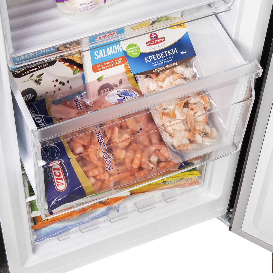 Система охлаждения морозильной камеры - «No Frost». Холодный сухой воздух равномерно распределяется при помощи вентилятора по всей камере. Благодаря этому на продуктах и внутренних поверхностях морозилки не образовывается иней. Теперь вам никогда не придется размораживать холодильник.