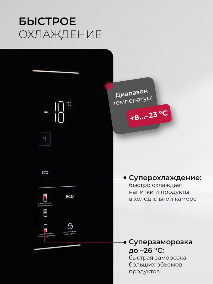 Холодильник LEX LKB185 оснащен современным инверторным компрессором, который гарантирует эффективную и практически бесшумную работу. Он также обеспечивает низкий расход энергии и долго поддерживает температуру без электропитания. Технология Total No Frost значительно упрощает обслуживание и помогает устанавливать оптимальную температуру и влажность.