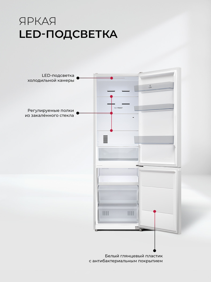 LED-лампы обеспечивают яркий свет, помогая вам быстро найти все, что нужно. Электронная панель управления делает настройку параметров интуитивно понятной. А перенавешиваемые двери делают холодильник LEX LKB185 универсальным для любой кухни.