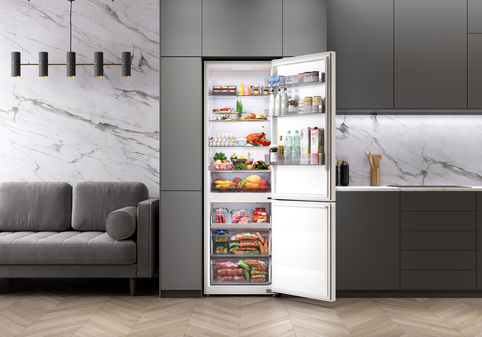 Два отделения с полезным объемом 409 литров дают возможность хранить все блюда и напитки на удобном уровне. Внутреннее пространство холодильника организовано максимально эффективно благодаря регулируемым полкам.