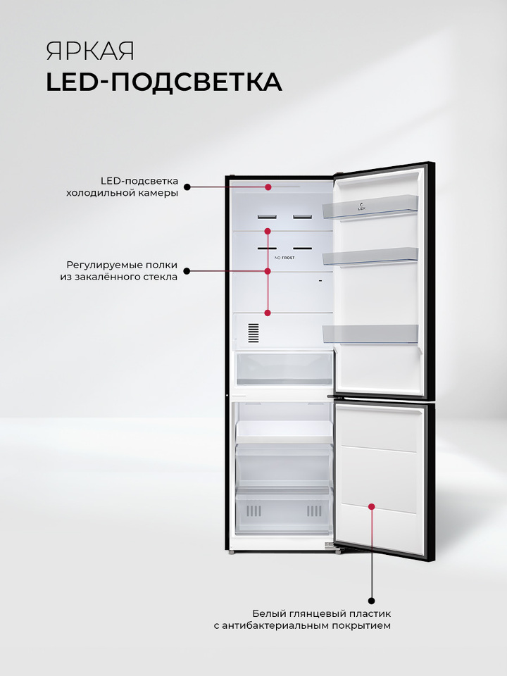 LED-лампы обеспечивают яркий свет, помогая вам быстро найти все, что нужно. Электронная панель управления делает настройку параметров интуитивно понятной. А перенавешиваемые двери делают холодильник LEX LKB201 универсальным для любой кухни.