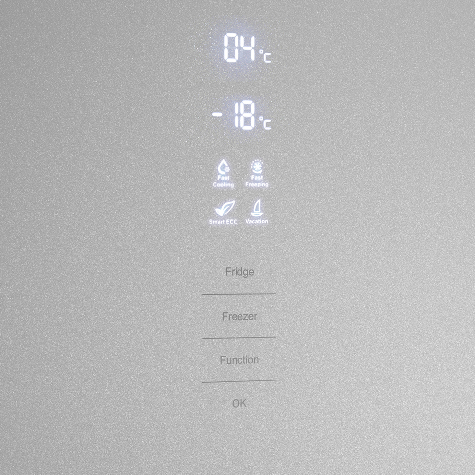 Современный двухкамерный холодильник TOTAL NO FROST шириной 60 см с инверторным компрессором, сенсорной панелью управления. Фасад выполнен из закаленного стекла.