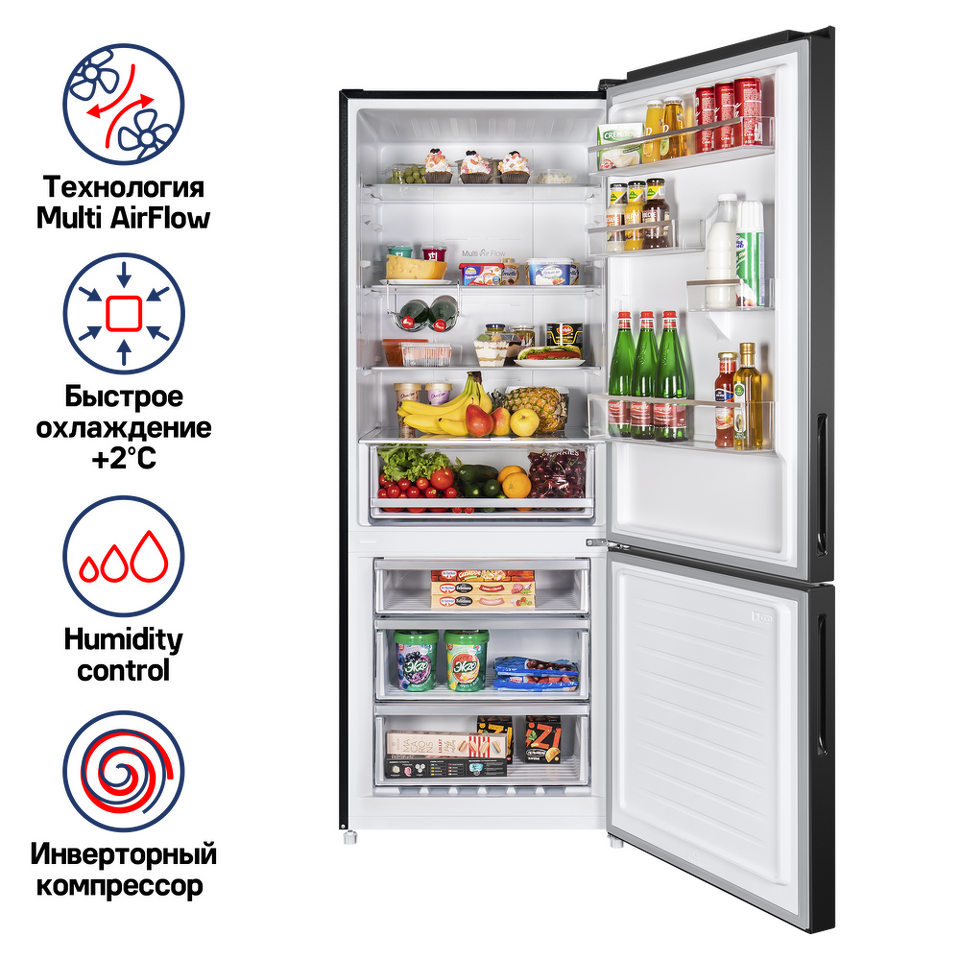 Система многопоточного охлаждения Multi Air Flow равномерно распределяет холодные воздушные потоки внутри холодильной и морозильной камер, тем самым поддерживая установленную температуру во всех уголках холодильника.