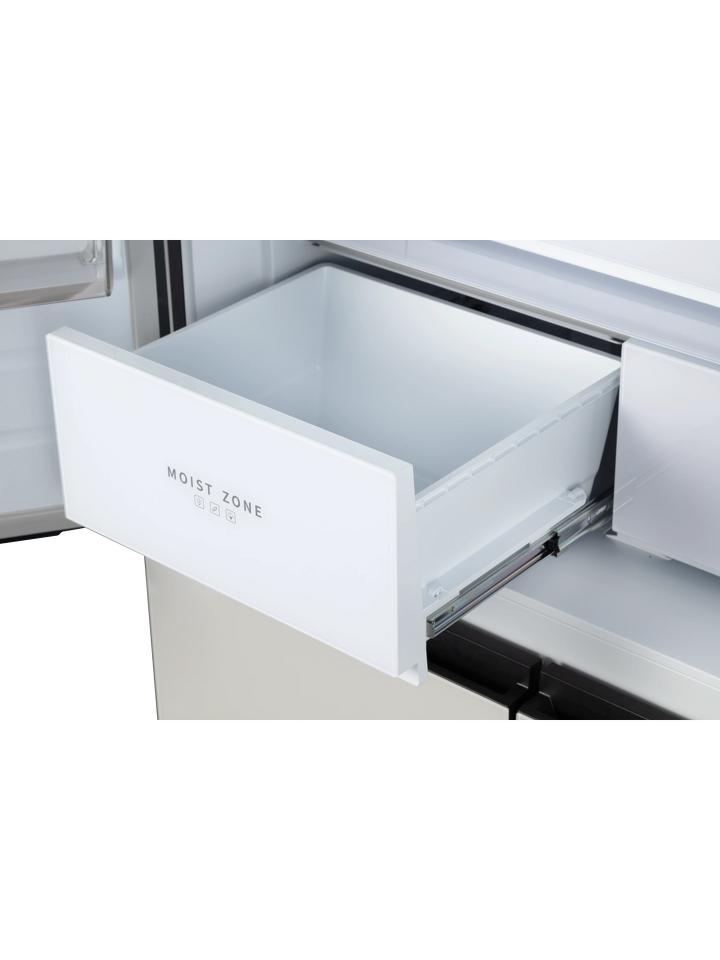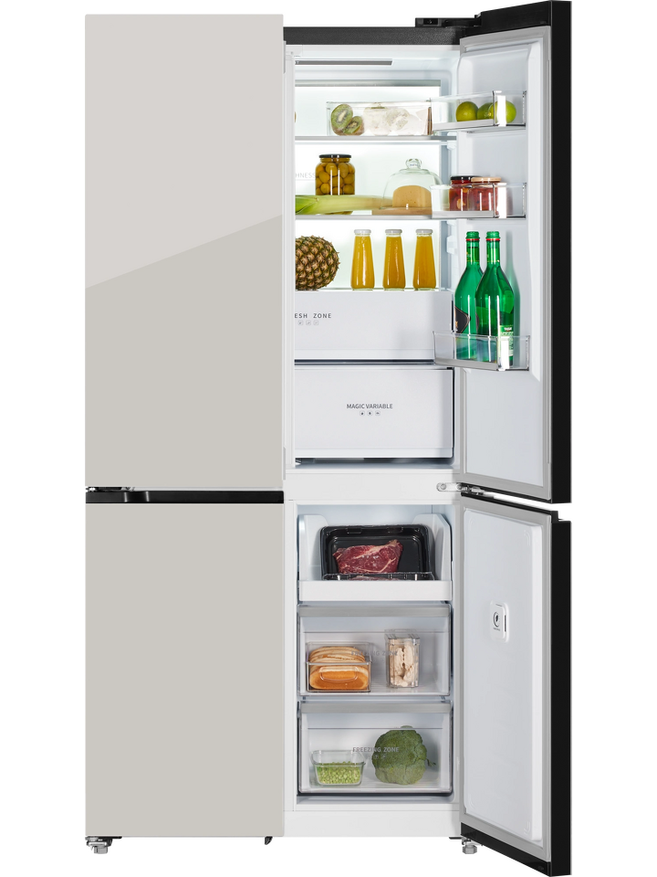HIBERG i-RFQ 705G Y — это уникальный четырехдверный холодильник с элегантным фасадом из бежевого стекла, рассчитанный на тех, кто ценит высокую вместимость, современный дизайн и функциональные решения. Высота модели составляет 191 см, а глубина — всего 60 см, что делает её идеальной для встраивания в кухонный гарнитур без зазоров и потери пространства. Такая компоновка особенно актуальна для современных интерьеров и не имеет прямых аналогов на российском рынке с точки зрения сочетания габаритов и функционала.
