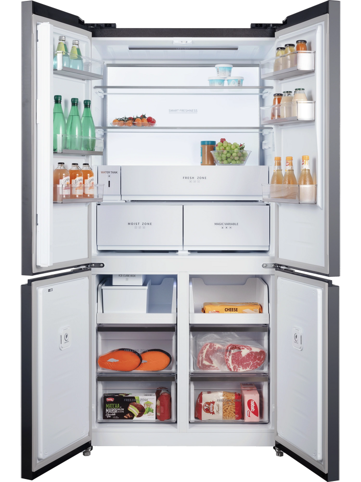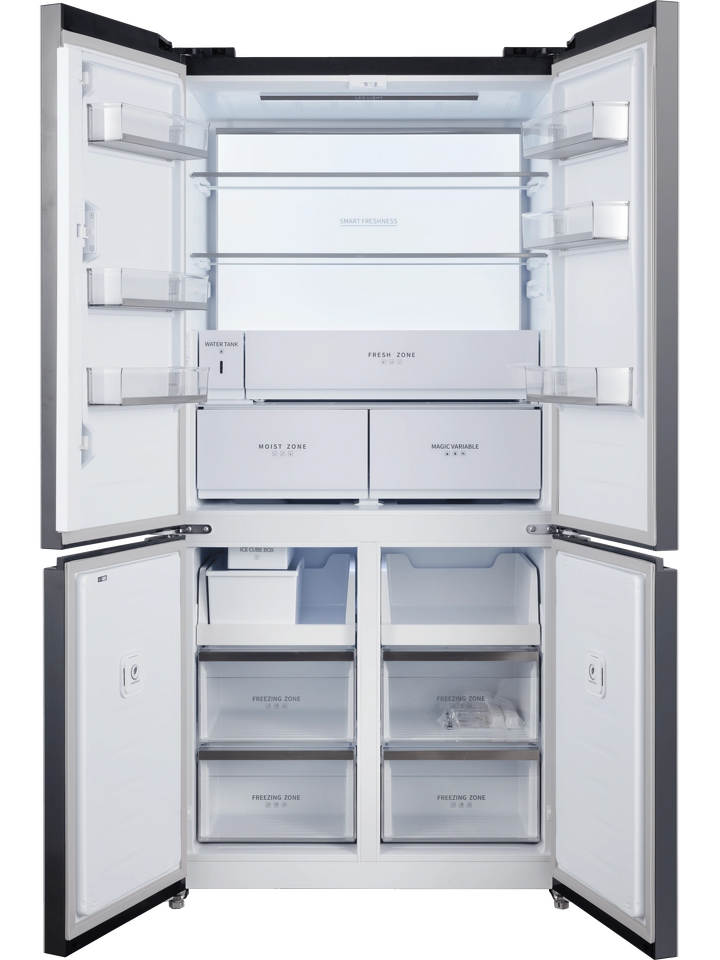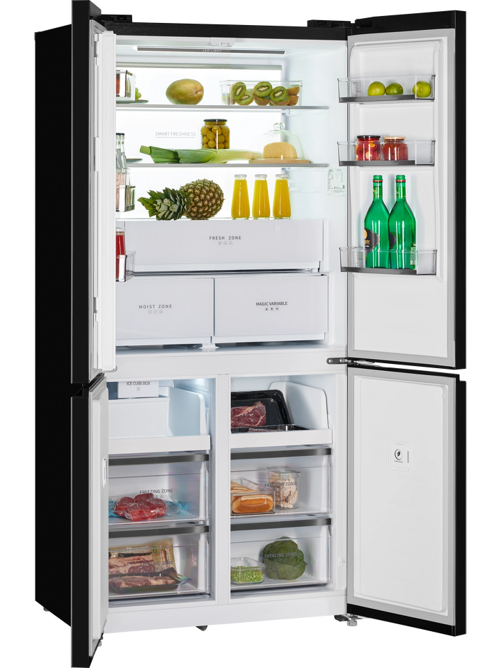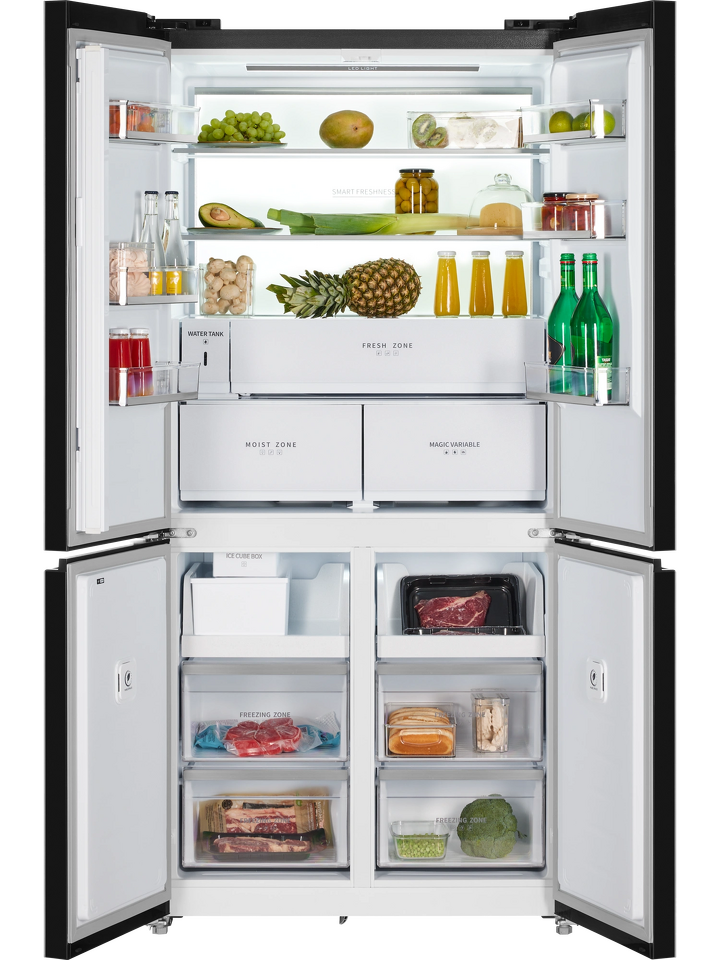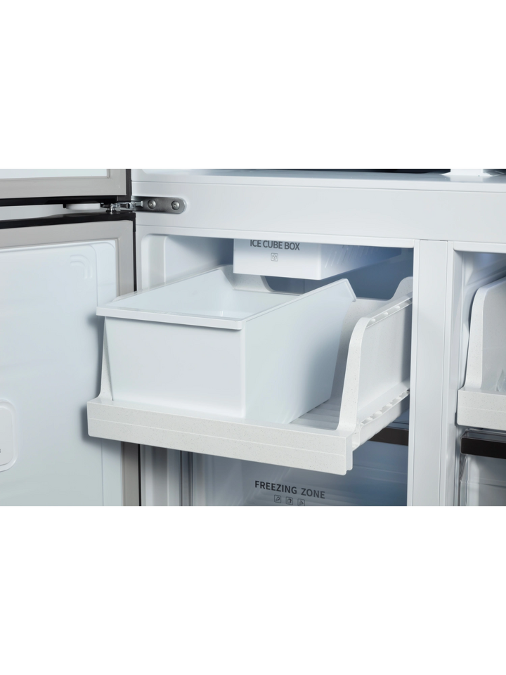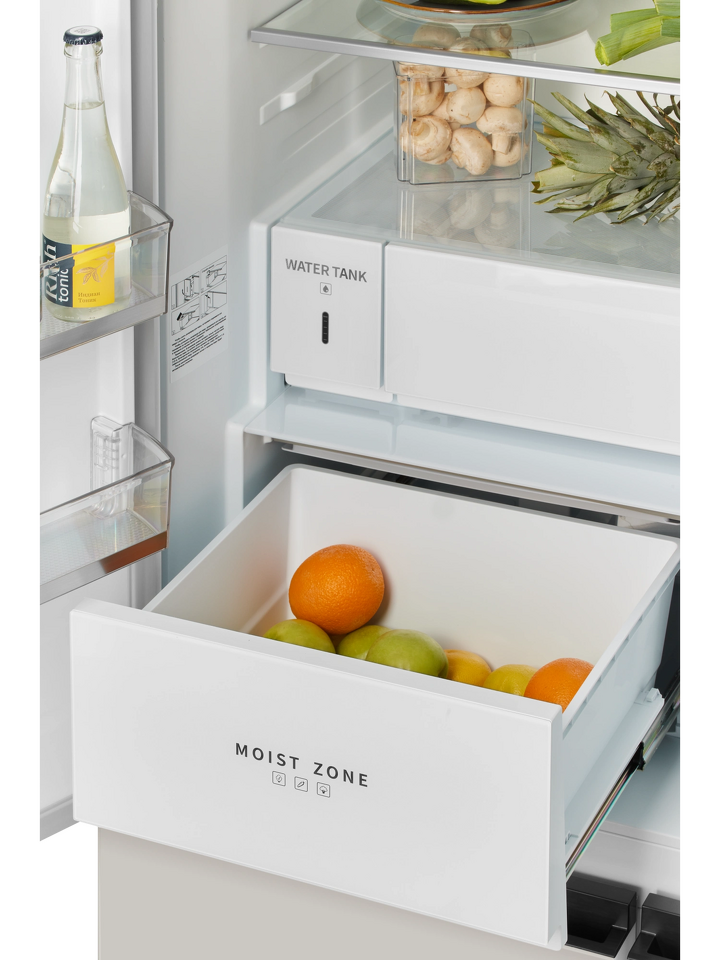 Впечатляющий общий объем 600 литров и продуманная организация внутреннего пространства позволяют легко распределять продукты, а двери с открытием на 90° обеспечивают полный доступ даже при установке рядом с мебелью. Фантомный сенсорный дисплей, встроенный в стеклянный фасад, сохраняет минимализм внешнего вида и интуитивность управления.