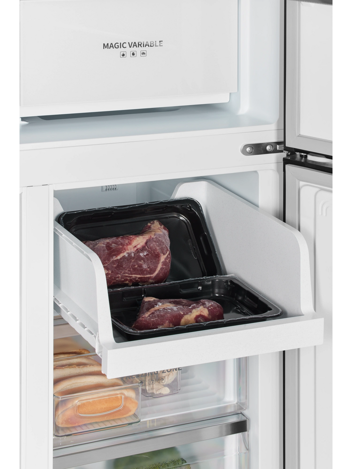 Интеллектуальное хранение и премиальная эргономика В холодильной камере расположено три вместительных выдвижных ящика на металлических направляющих. Один из них оснащён регулятором влажности и предназначен для овощей, зелени и фруктов — здесь поддерживаются оптимальные условия для сохранения свежести. Второй — это просторная мультитемпературная зона FLEX ZONE с возможностью выбора одного из трёх режимов: -4, 0 или +4 °С. Благодаря своей глубине и объему, этот ящик отлично подходит для хранения мяса, напитков или фруктов — в зависимости от потребностей.