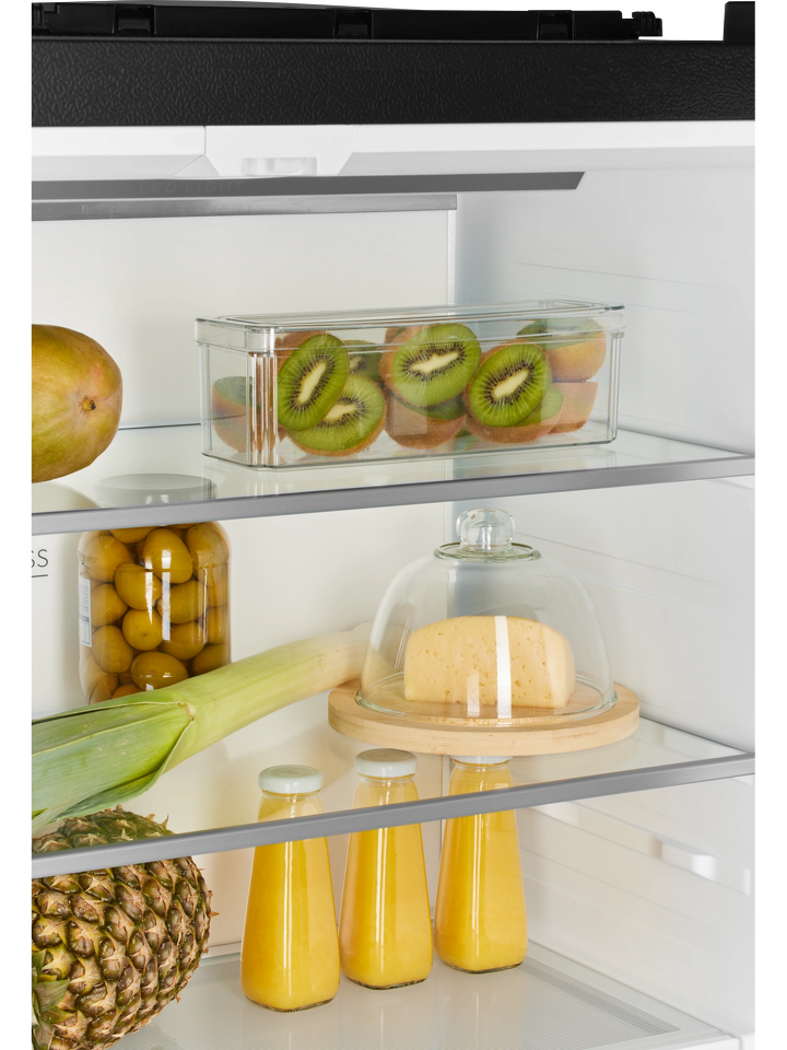 Все ящики имеют фасады из закаленного стекла, что придаёт им премиальный внешний вид и устойчивость к повреждениям. Полки выполнены из стекла, боковые карманы вместительны, а Ambient-подсветка задней стенки мягко освещает содержимое, делая использование холодильника комфортным в любое время суток.