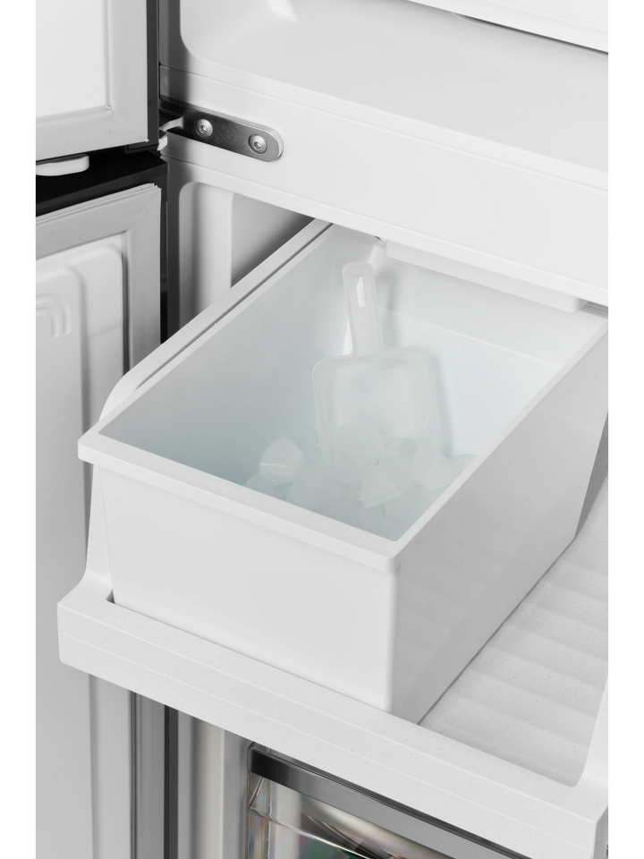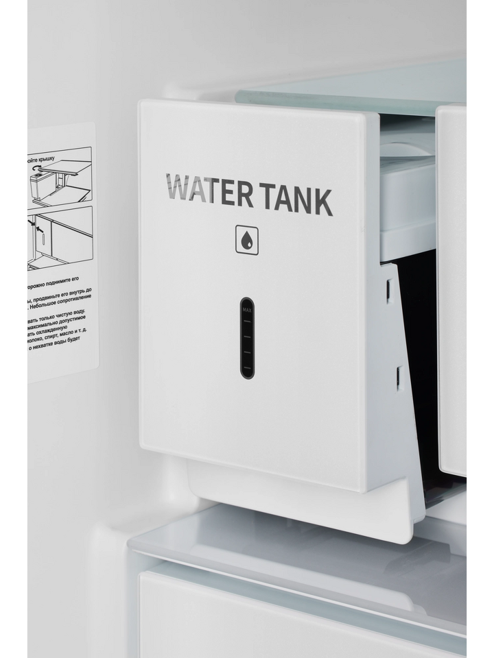 Одним из ключевых преимуществ модели является автоматический ледогенератор, который не требует подключения к водопроводу. Вода заливается вручную во встроенный резервуар объёмом 1,6 литра — и вы всегда получаете свежий лед в любое время. В морозильной камере предусмотрен контейнер для сбора льда, а в комплекте поставляется удобная лопатка.