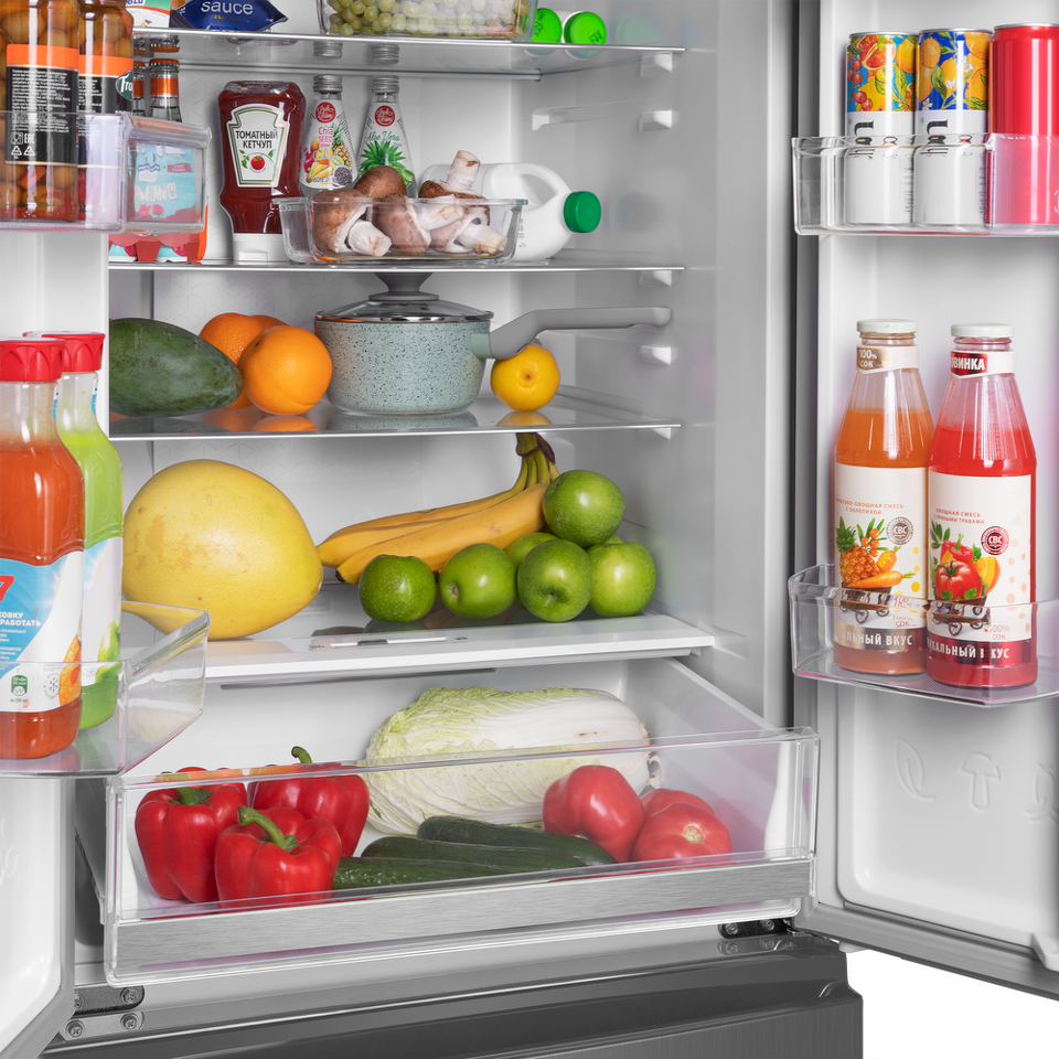 Полки из закалённого ударопрочного стекла позволяют хранить крупные и габаритные продукты и тяжёлую посуду. Полки оснащены стильными металлическими фреймами. И это не только декоративный элемент, придающий холодильнику современный вид: фреймы защищают от трещин и сколов, а также препятствуют стеканию жидкостей в случае их пролития.