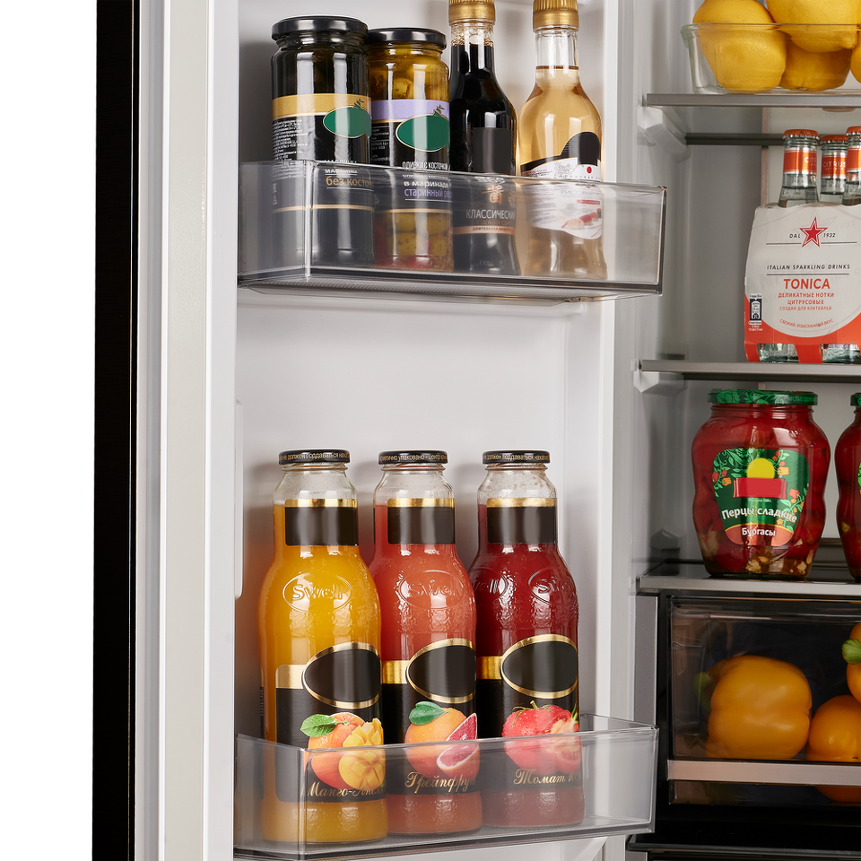 Продукты хорошо охлаждются на всех полках и карманах. Система равномерного охлаждения непрерывно контролирует температуру в разных уголках камеры и равномерно распределяет холодный воздух, благодаря чему продукты долго сохраняют свою свежесть.