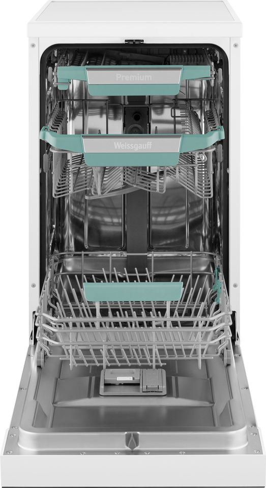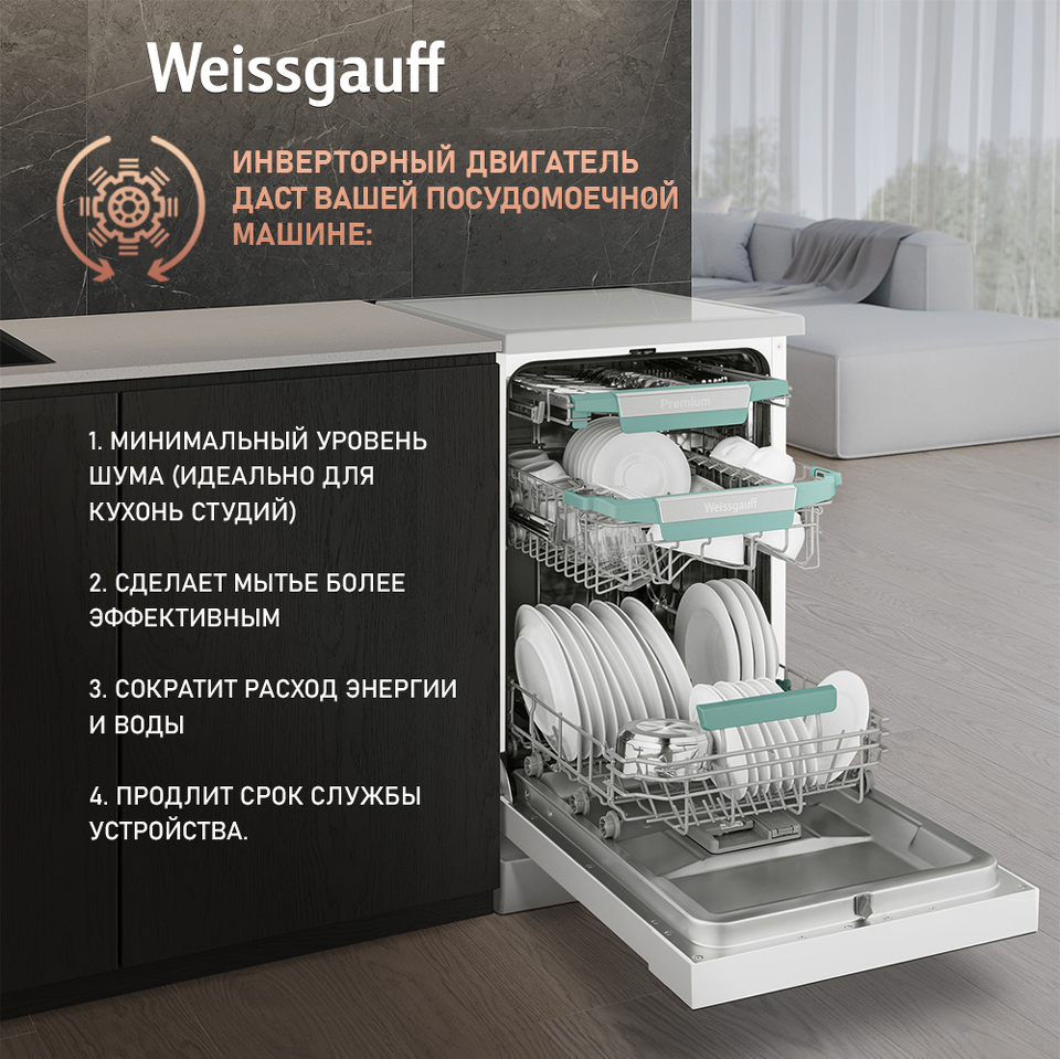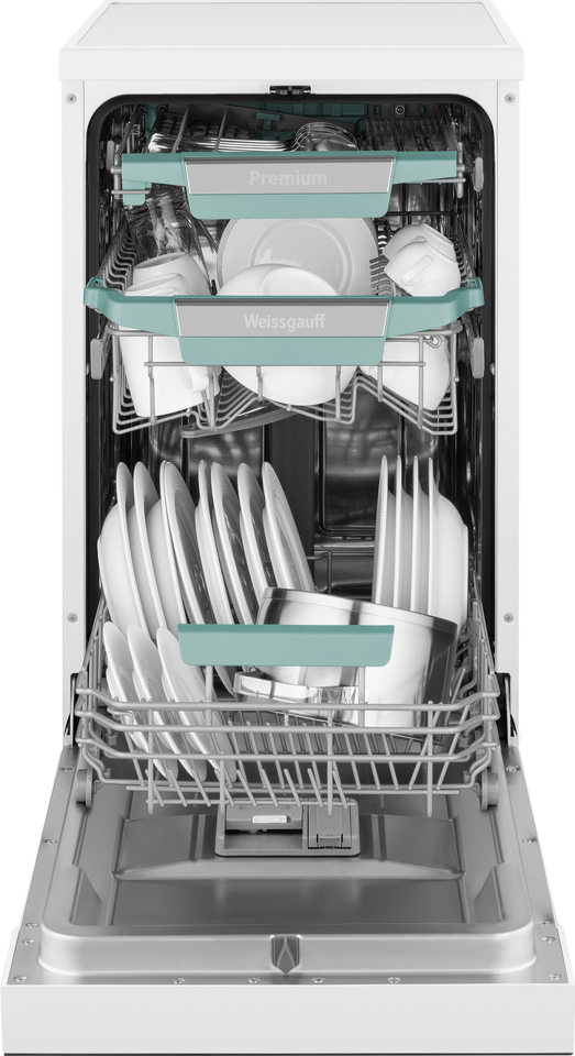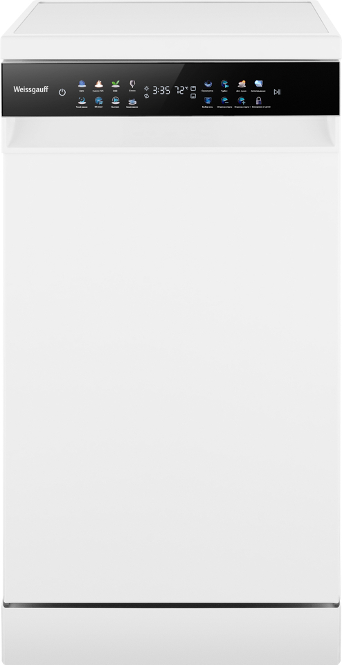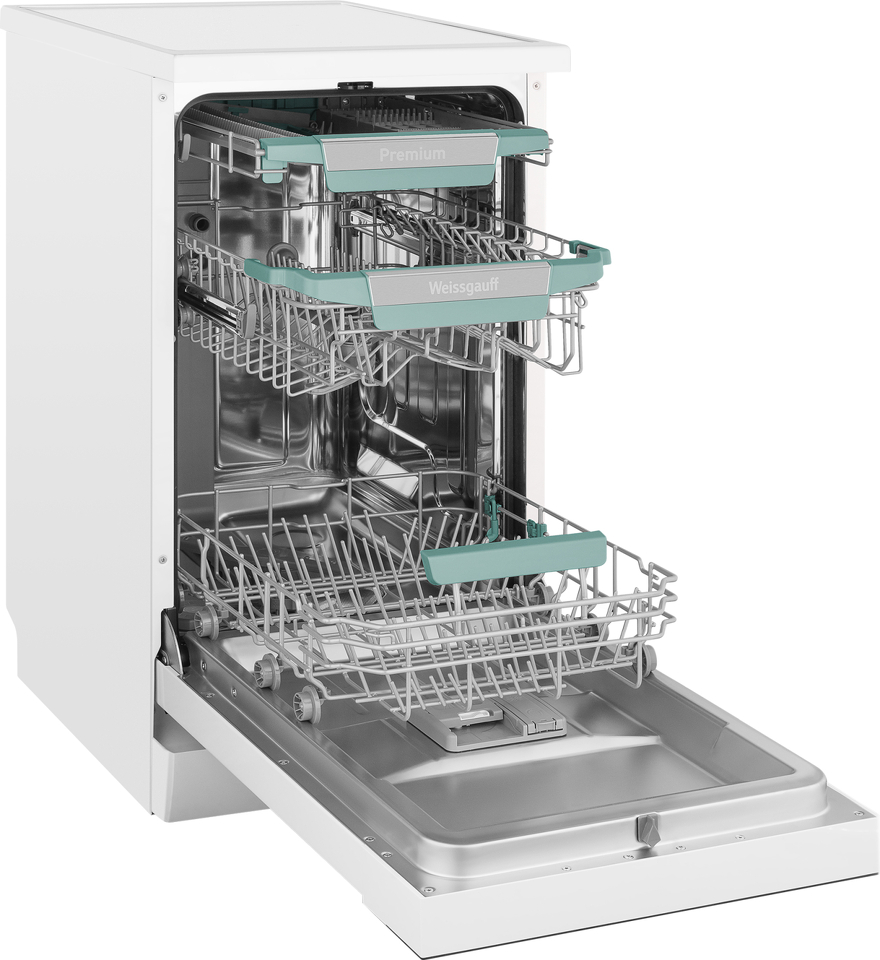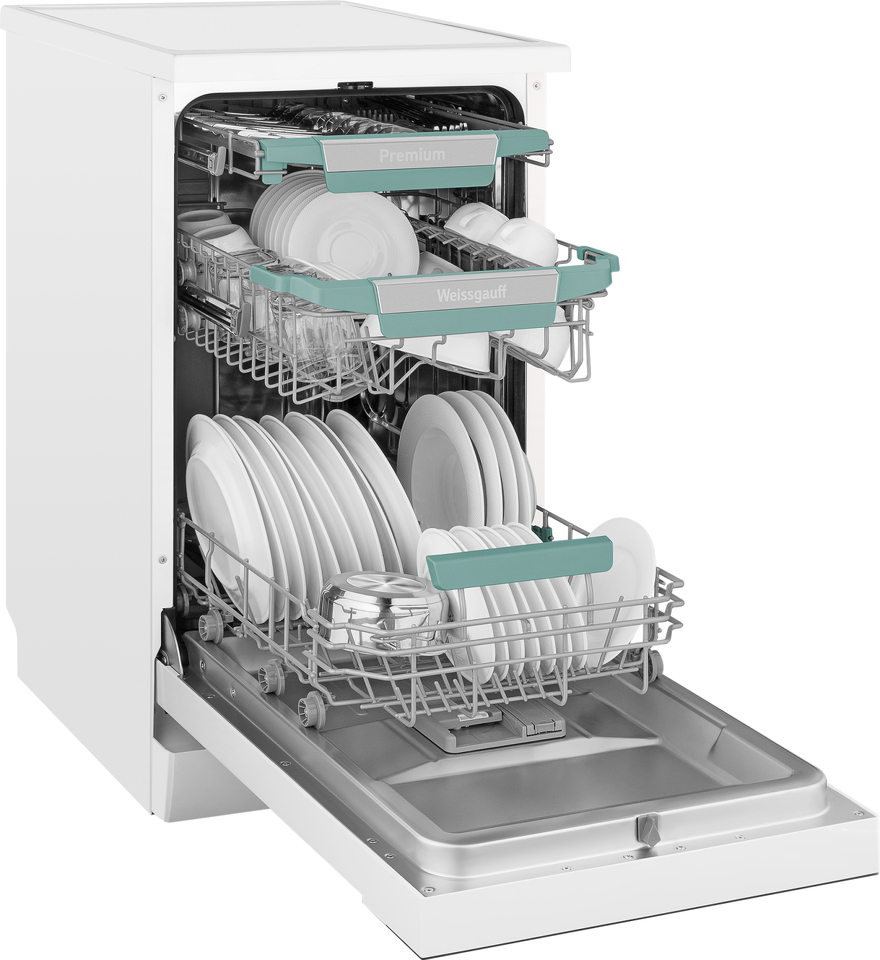 Узкая отдельностоящая посудомоечная машина Weissgauff c корпусом, выполненным в белом цвете с инновационным цветным дисплем SMART SCREEN с сенсорным управлением, инверторным двигателем и функцией автоматического открытия дверцы, не только сэкономит место на вашей кухне, но и обеспечит идеальный результат: 3 корзины позволят расположить посуду оптимальным образом для достижения наилучшего качества мытья, а вместимость посуды до 10 комплектов - это не только экономия места на кухне, но и отличное качество мытья вашей посуды.