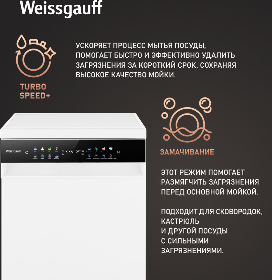 До 10 комплектов посуды одновременно вы можете расположить в данной посудомоечной машине, благодаря современным продуманным и эргономичным корзинам, которыми Weissgauff оснастили эту модель