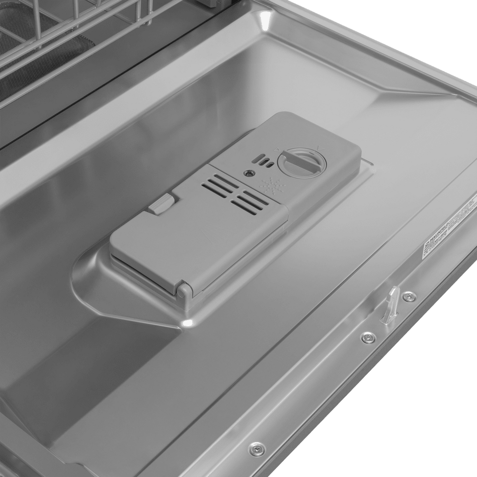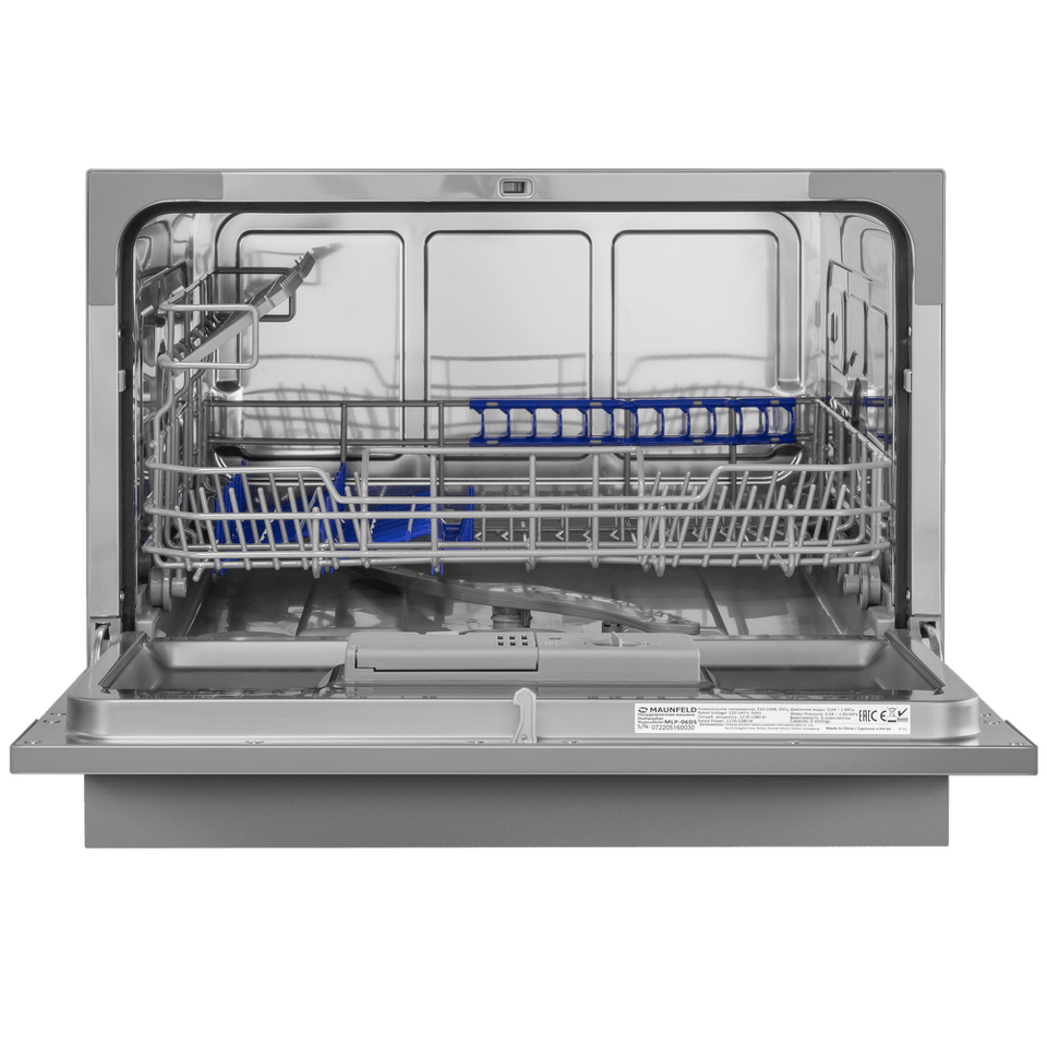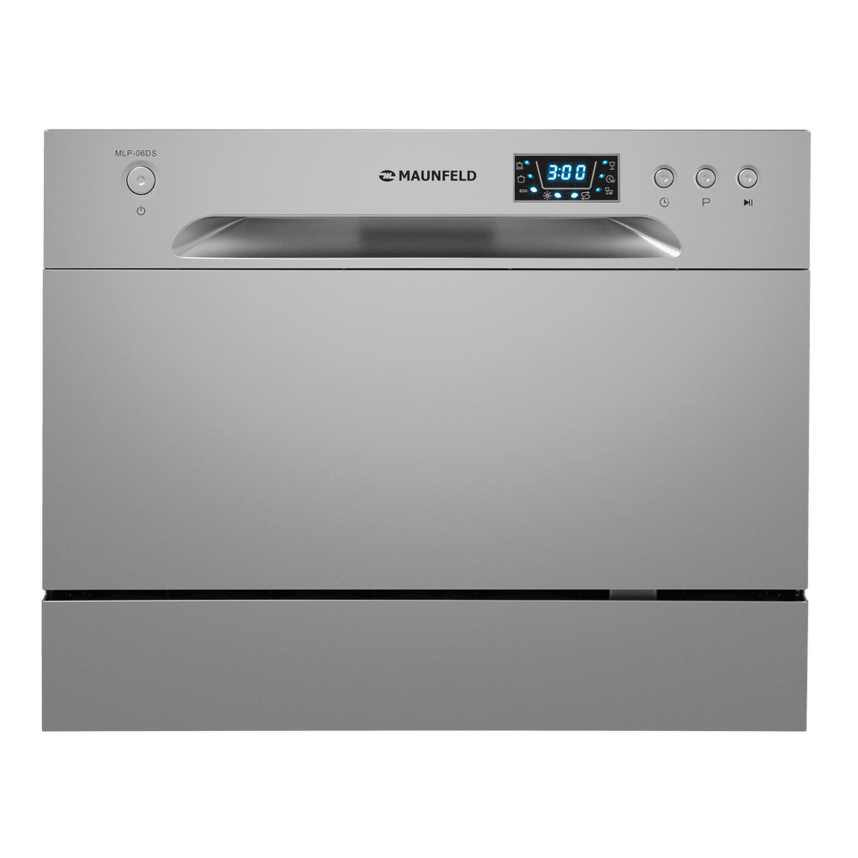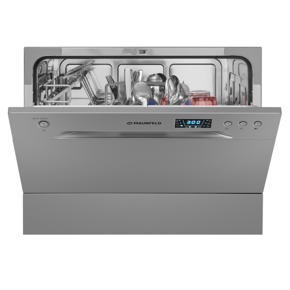 Электронное управление с дисплеем расположено в торце загрузочной дверцы. Функционал данной модели позволяет вам выбрать программу мойки, включить половинную загрузку, выставить время отсрочки старта (1-24 часов).
