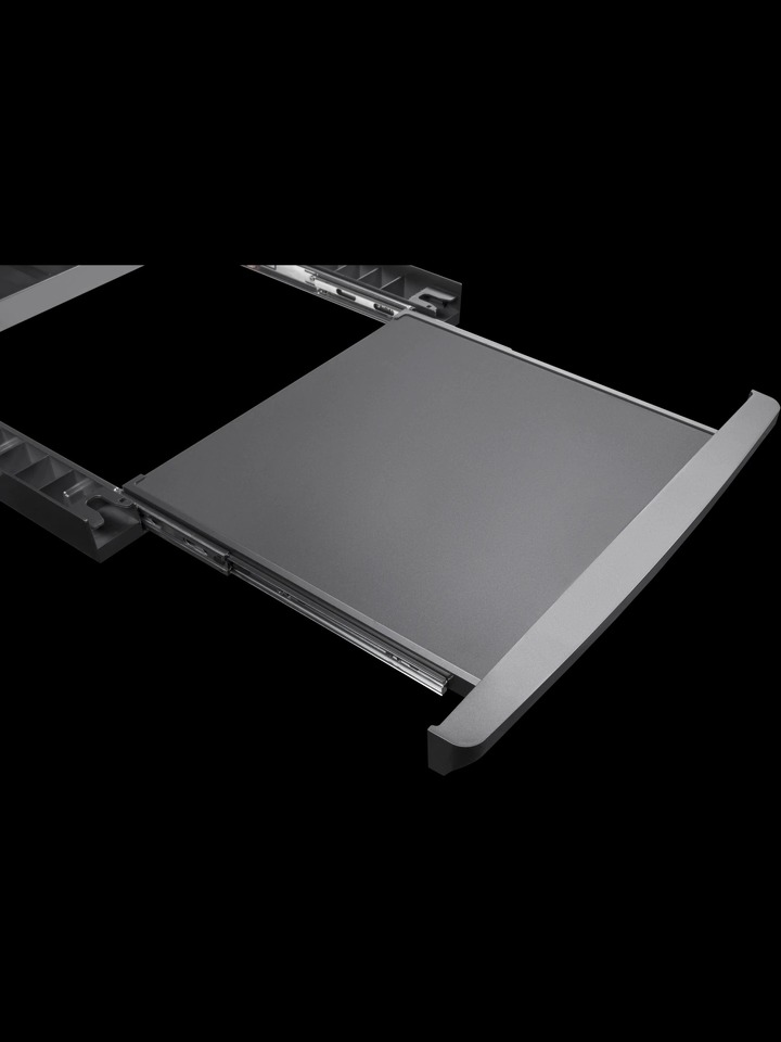 Соединительный элемент оснащен выдвижной полкой для белья, благодаря которой будет удобно загружать белье в машины, а также складывать вещи после стирки или просушивания.