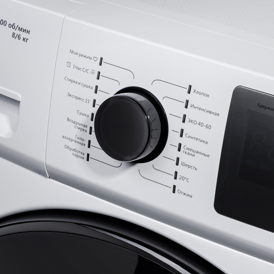 Электронное управление с LCD дисплеем. 15 режимов стирки и 4 режима сушки