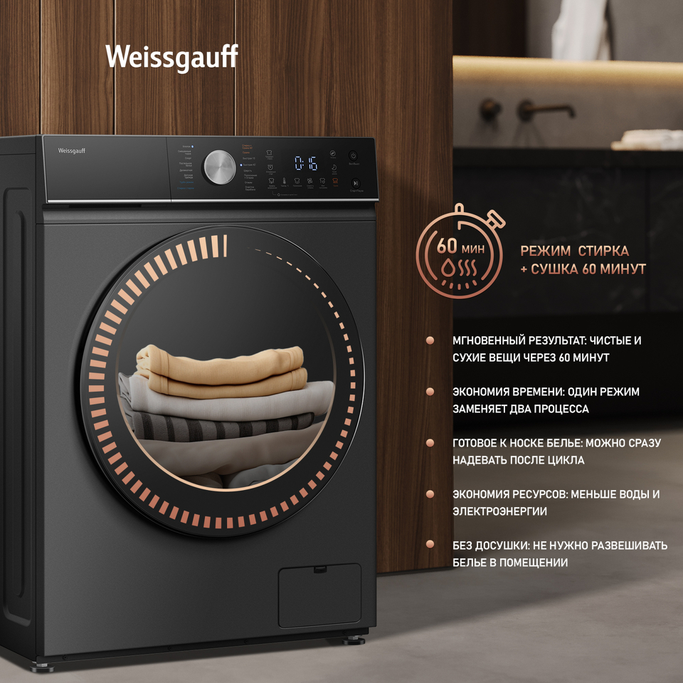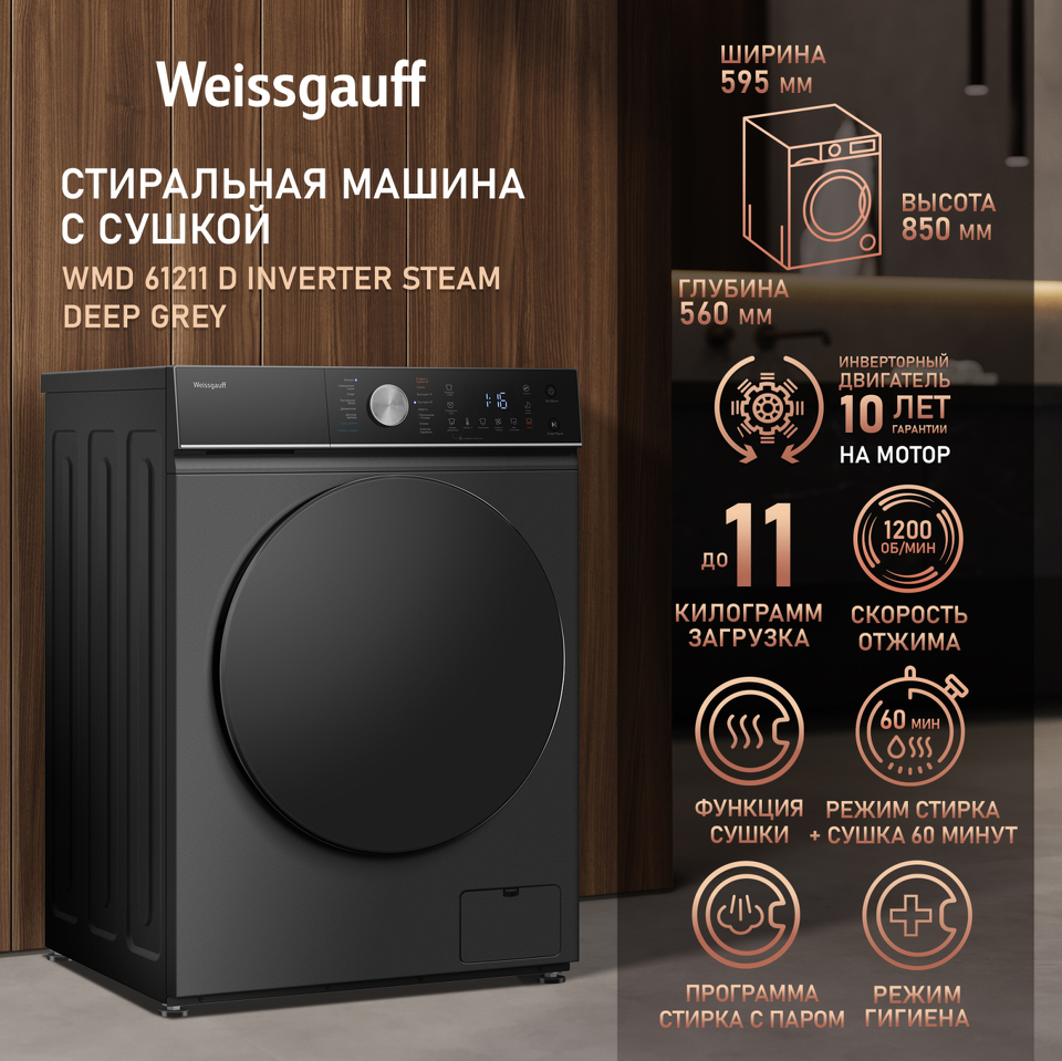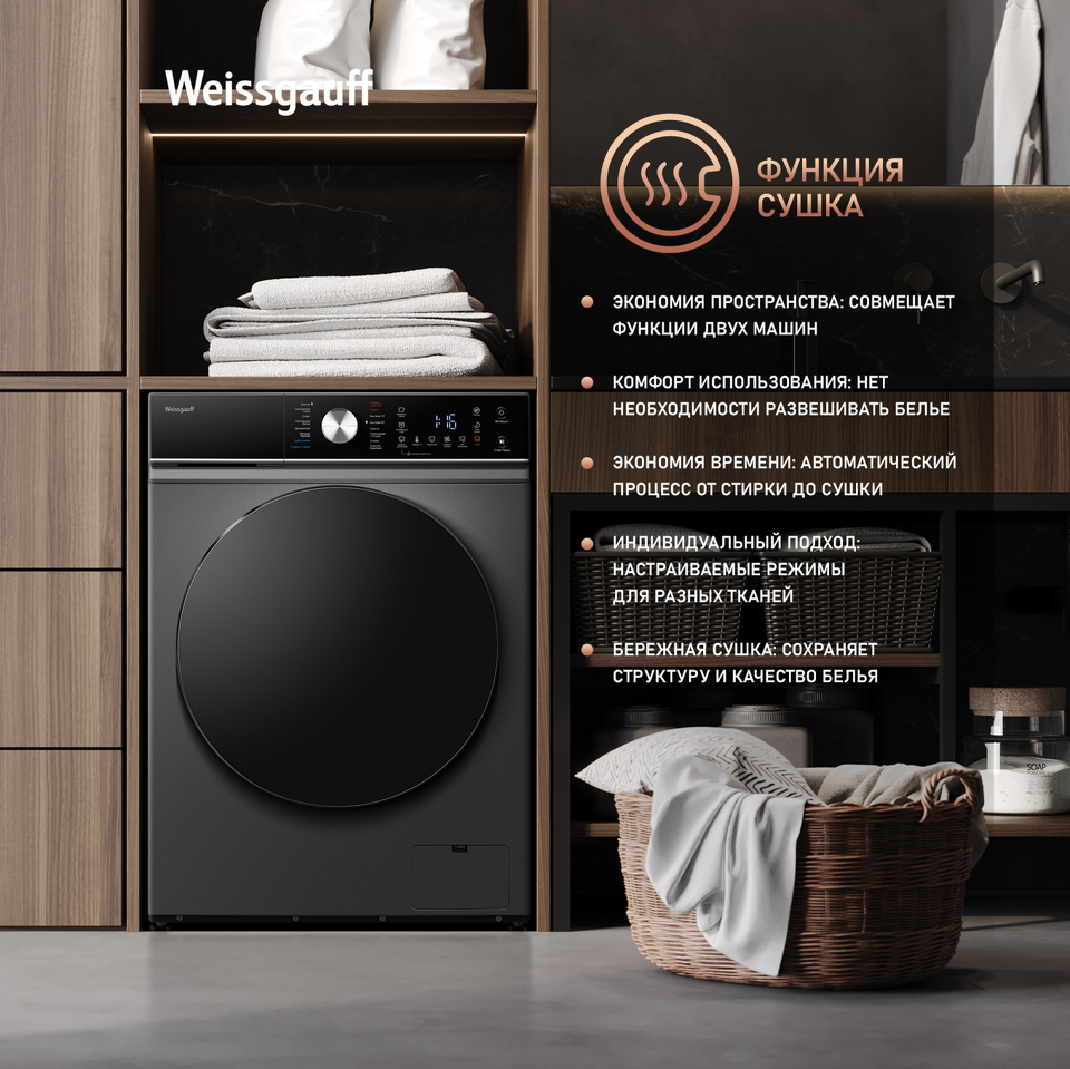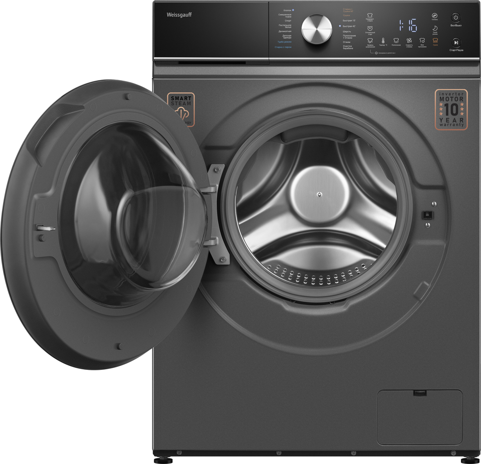 Отдельностоящая стиральная машина с сушкой, обработкой паром, оснащенная инверторным двигателем, имеет впечатляющий показатель загрузки до 11 кг белья при стирке и 7 кг при сушке, а также впечатляющую скорость отжима до 1200 оборотов в минуту - что делает эту модель одной из наиболее передовых в линейке стиральных машин Weissgauff.